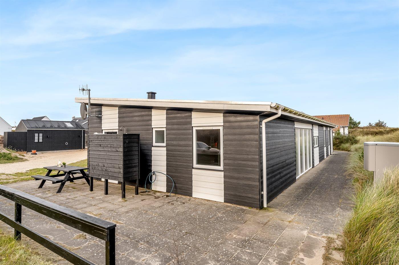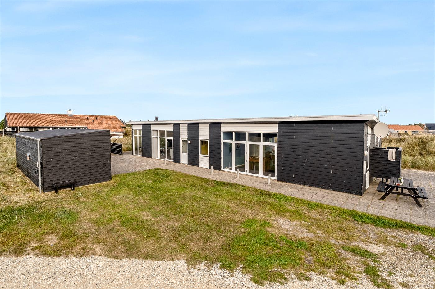 I klitterne på Åstien ligger dette dejlige, rummelige sommerhus med masser af plads samt aktivitetsrum . Huset er bygget så aktivitetsrummet deler hovedhus og gæste- børneafdeling.