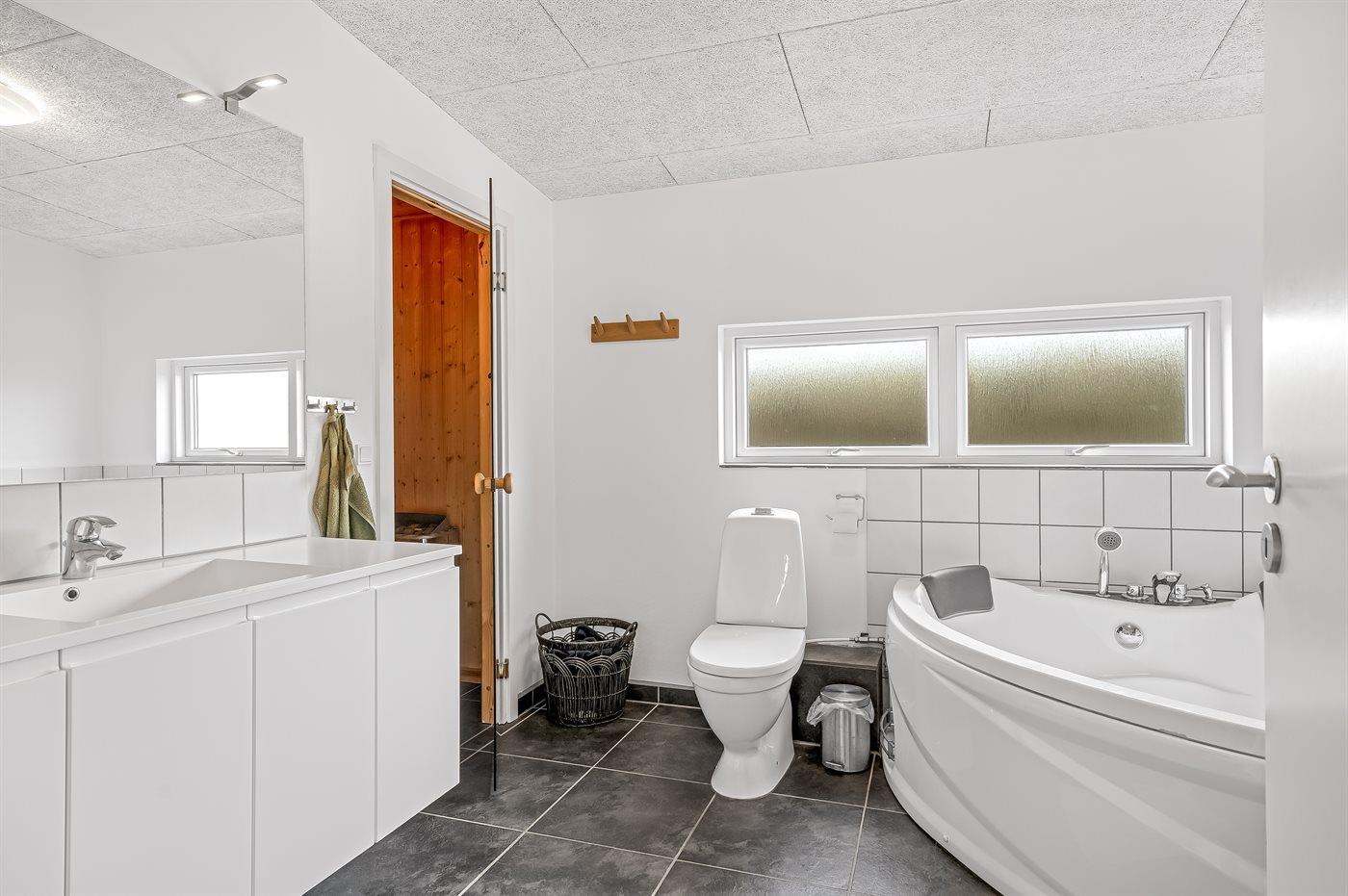Der er 2 badeværelser med bruseniche og 2 toiletter. Der er gulvvarme på 2 badeværelser. I saunaen er der mulighed for afslapning.