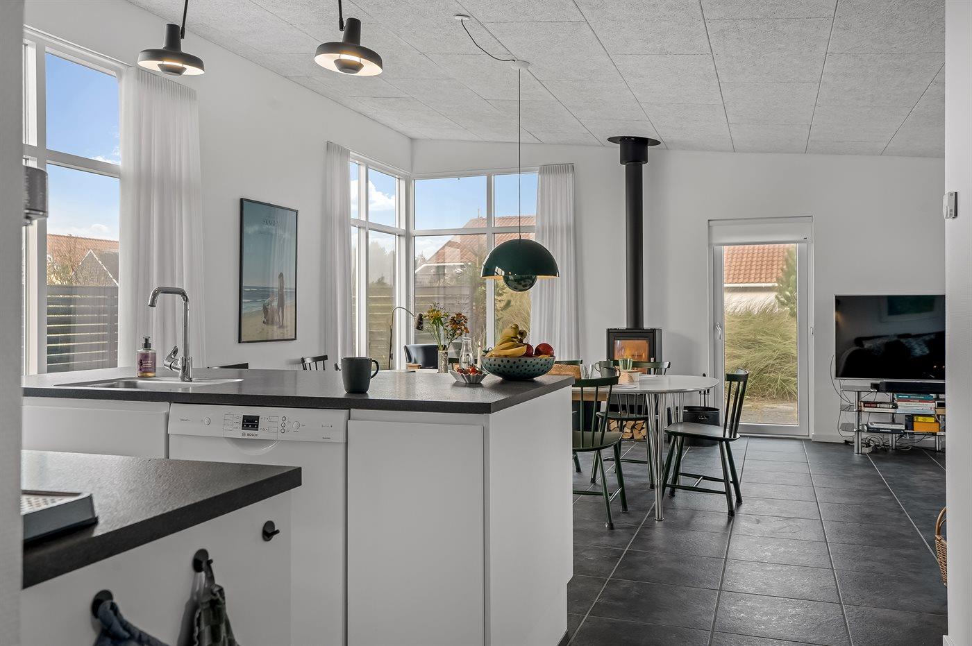 Køkkenet er udstyret med 1 køleskab. Der er 4 keramiske kogeplader, varmluftovn samt opvaskemaskine.