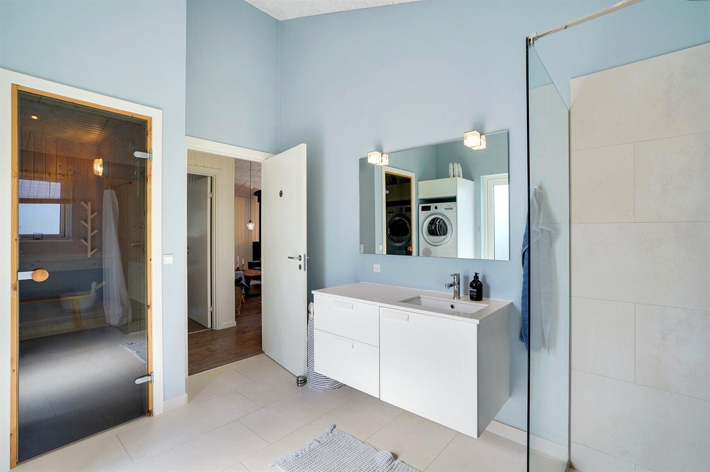 Der er 2 badeværelser med bruseniche og toilet. Der er gulvvarme på begge badeværelser. Saunaen ligger i forbindelse med det ene badeværelse. Udenfor badeværelse med sauna er der udendørsbruser.