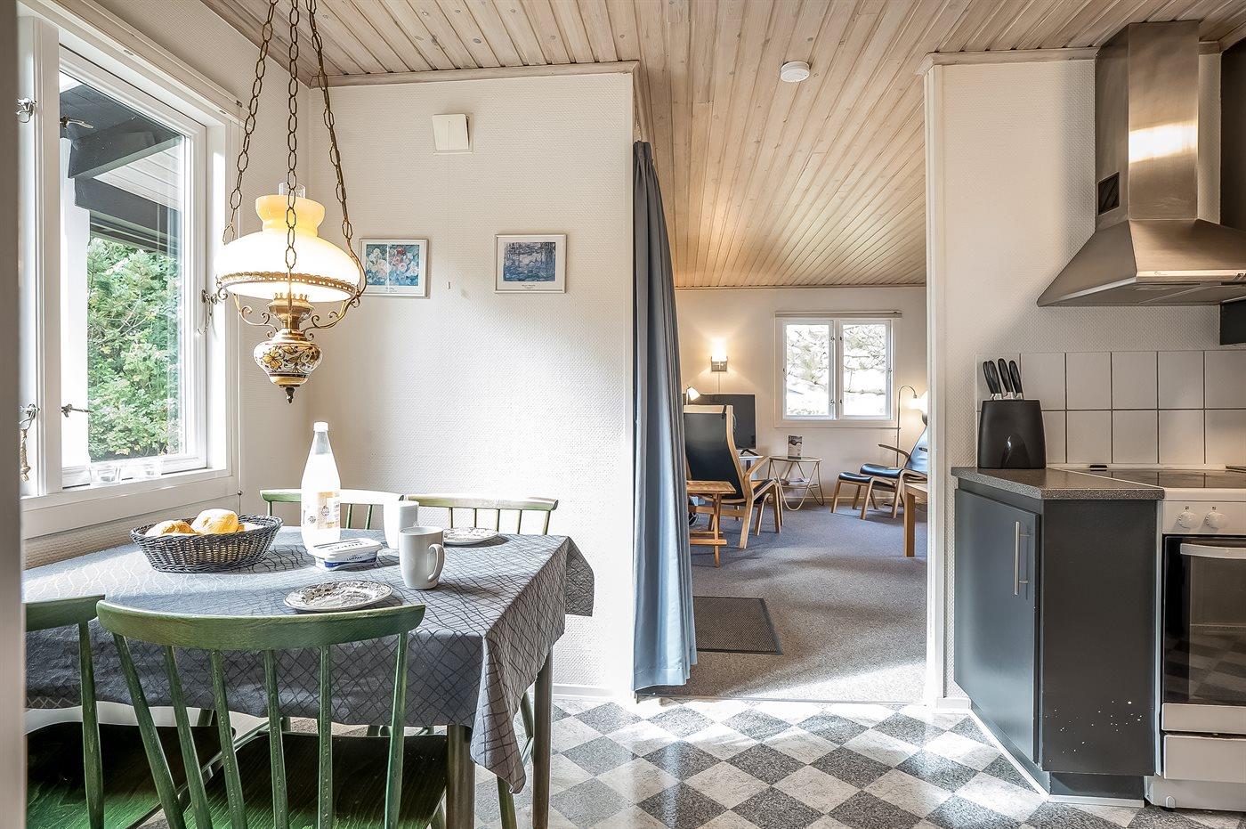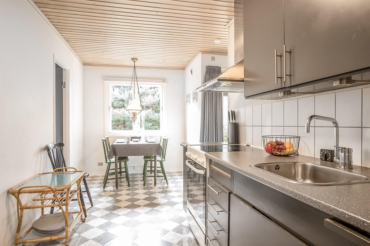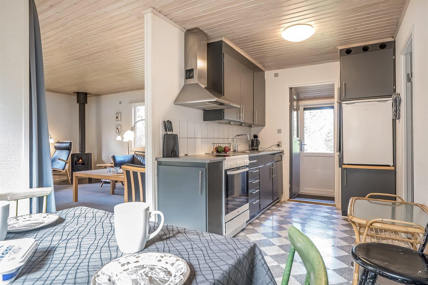 Køkkenet er udstyret med 1 køleskab. Der er 4 keramiske kogeplader, varmluftovn.