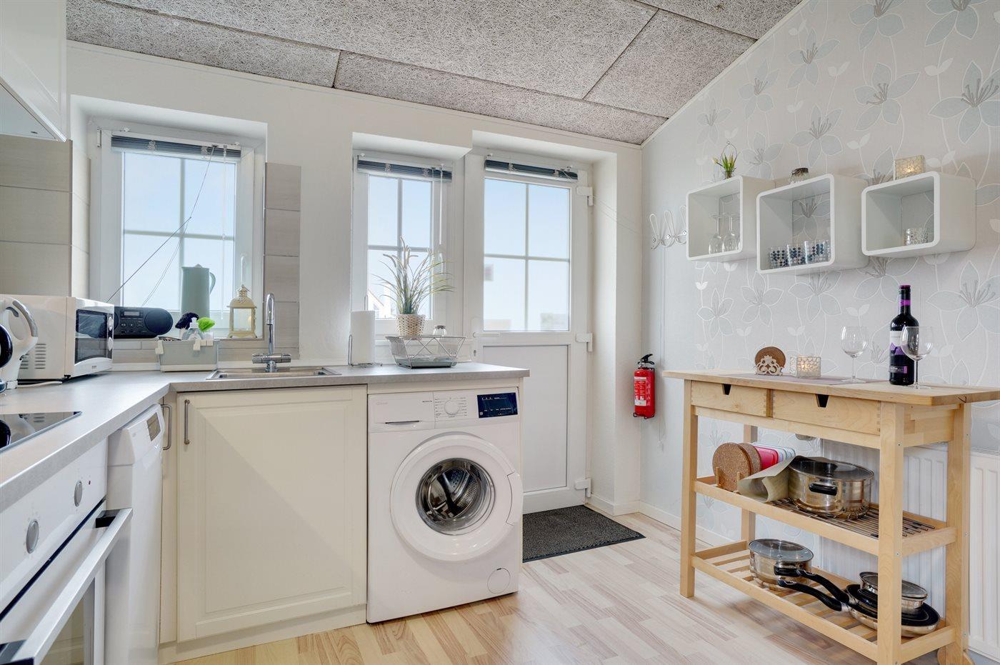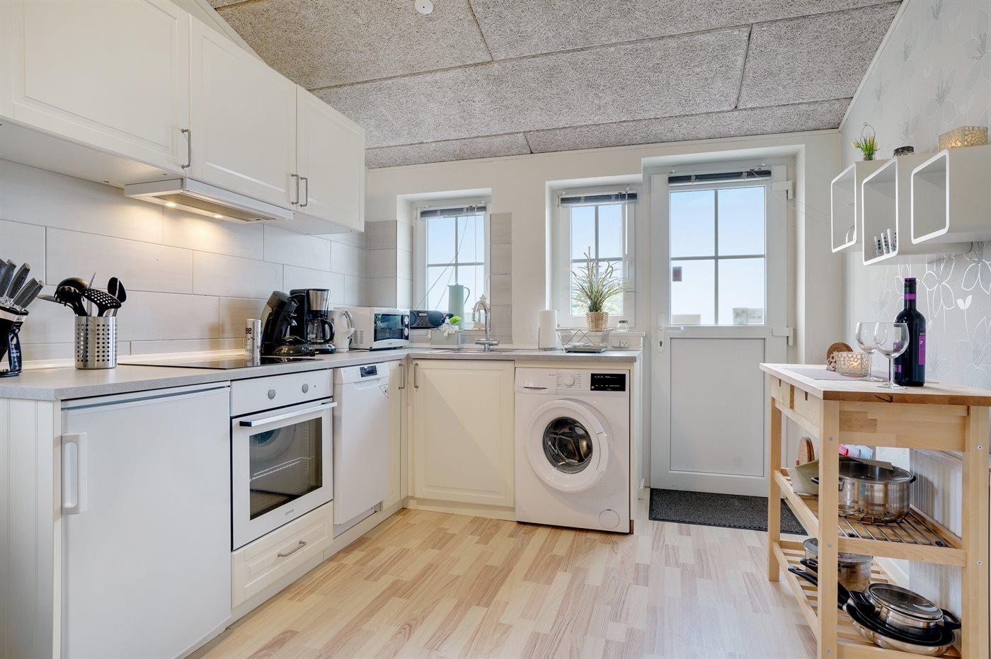 Køkkenet er udstyret med 1 køleskab. Der er 4 keramiske kogeplader, varmluftovn, mikrobølgeovn samt opvaskemaskine.