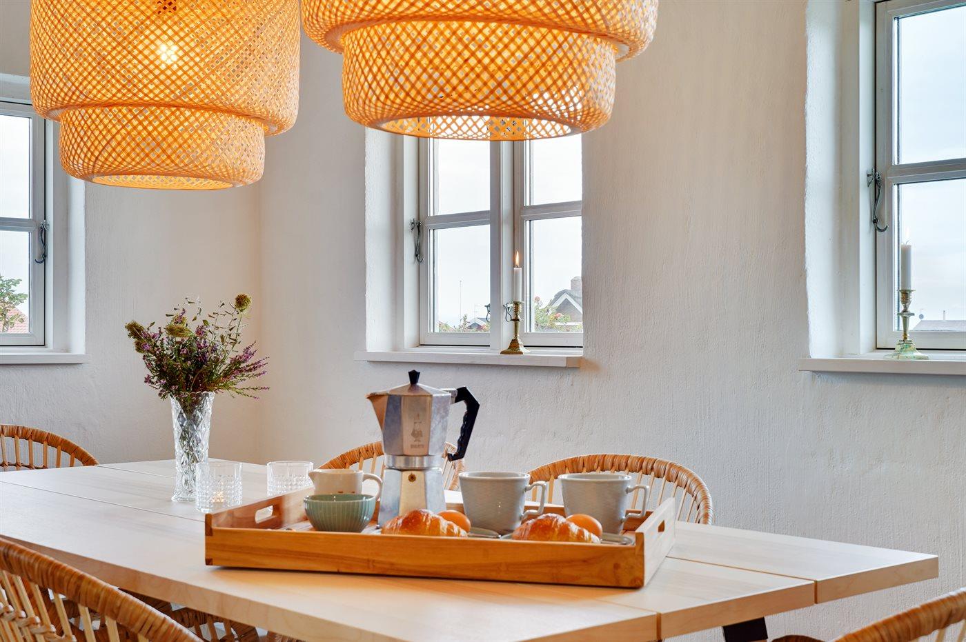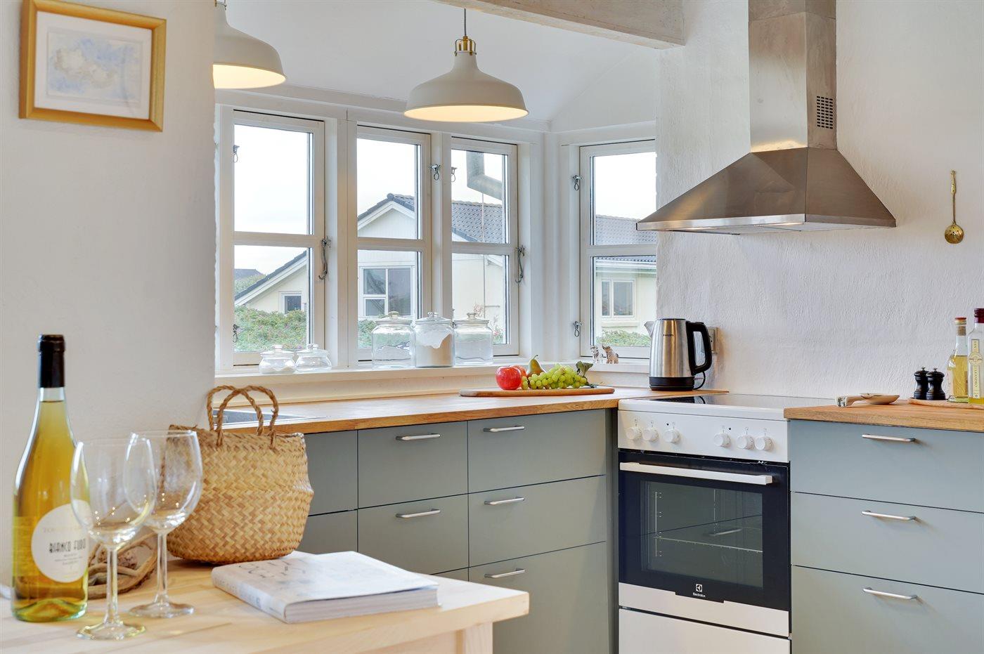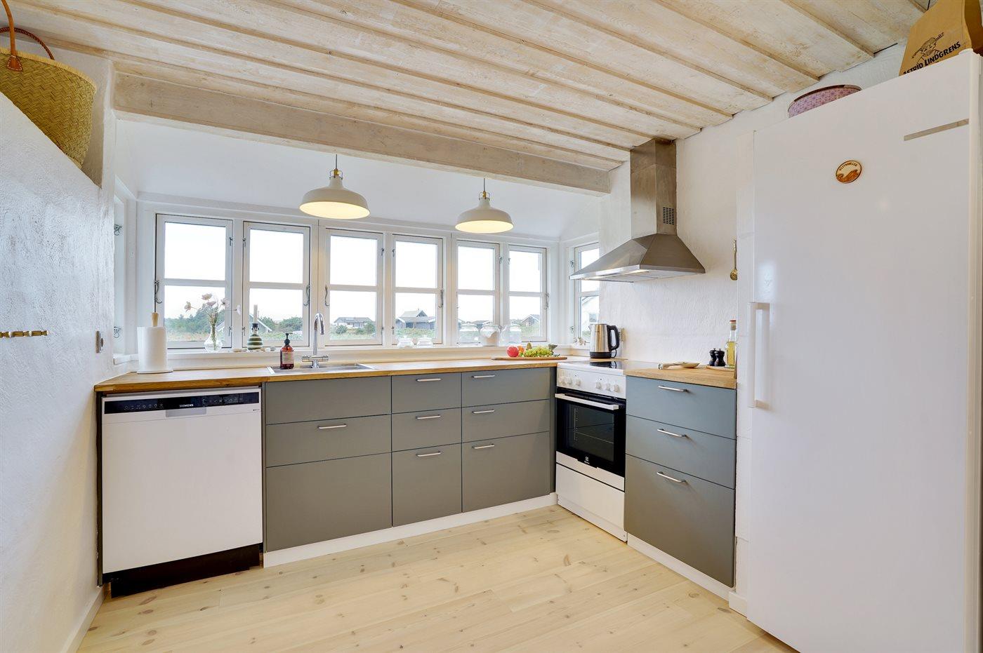 Køkkenet er udstyret med 1 køleskab. Der er 4 keramiske kogeplader, varmluftovn samt opvaskemaskine.