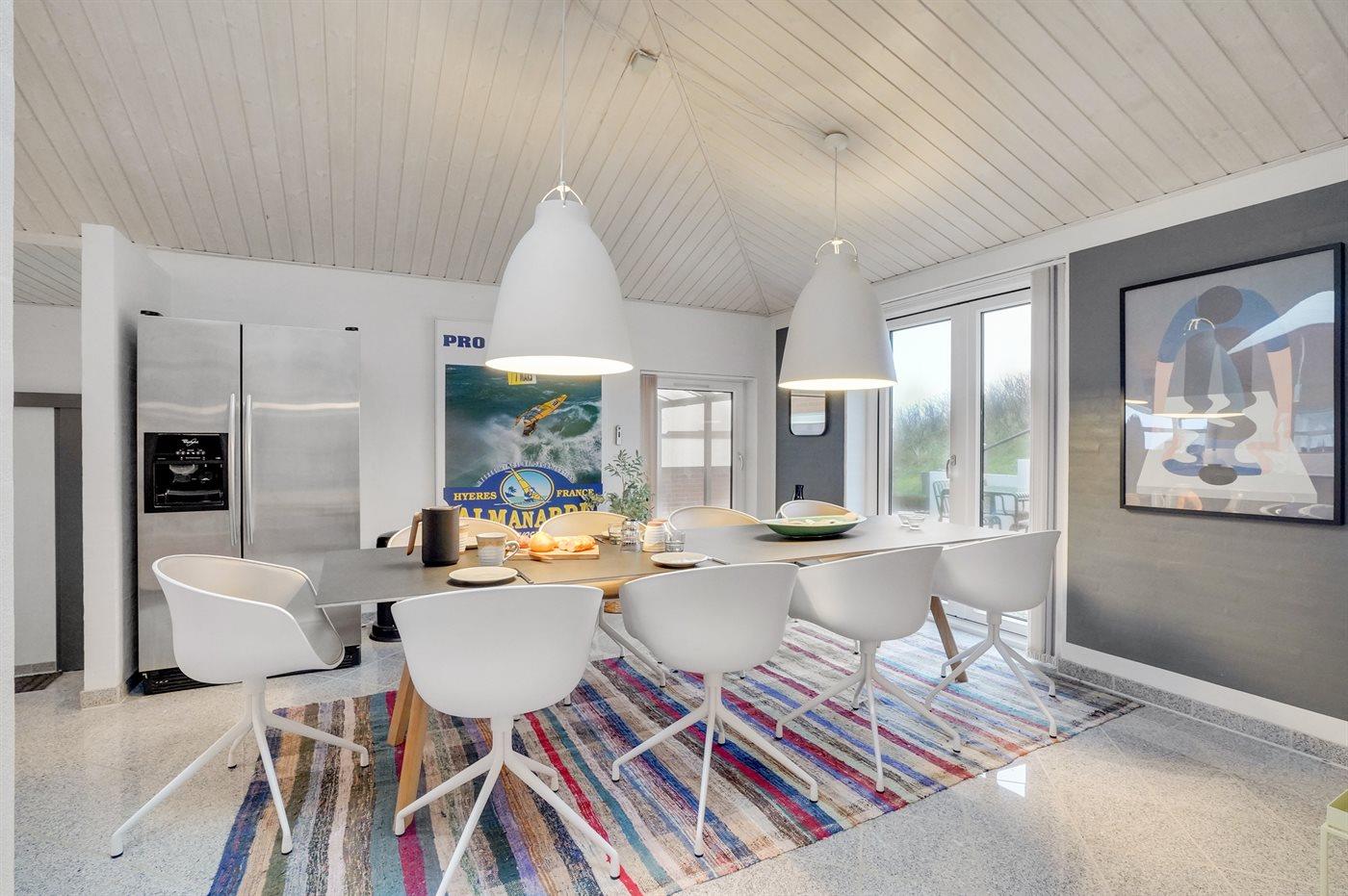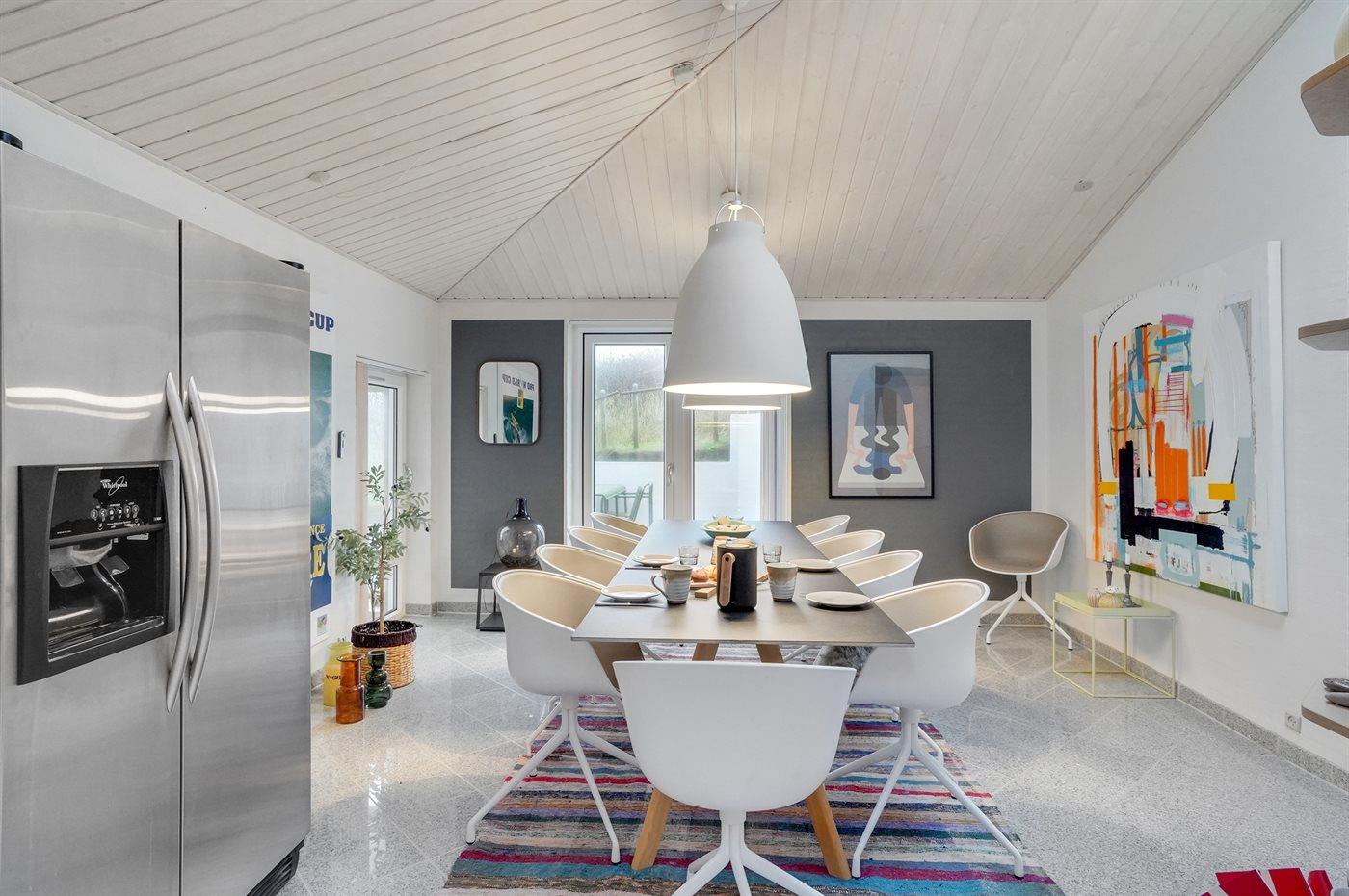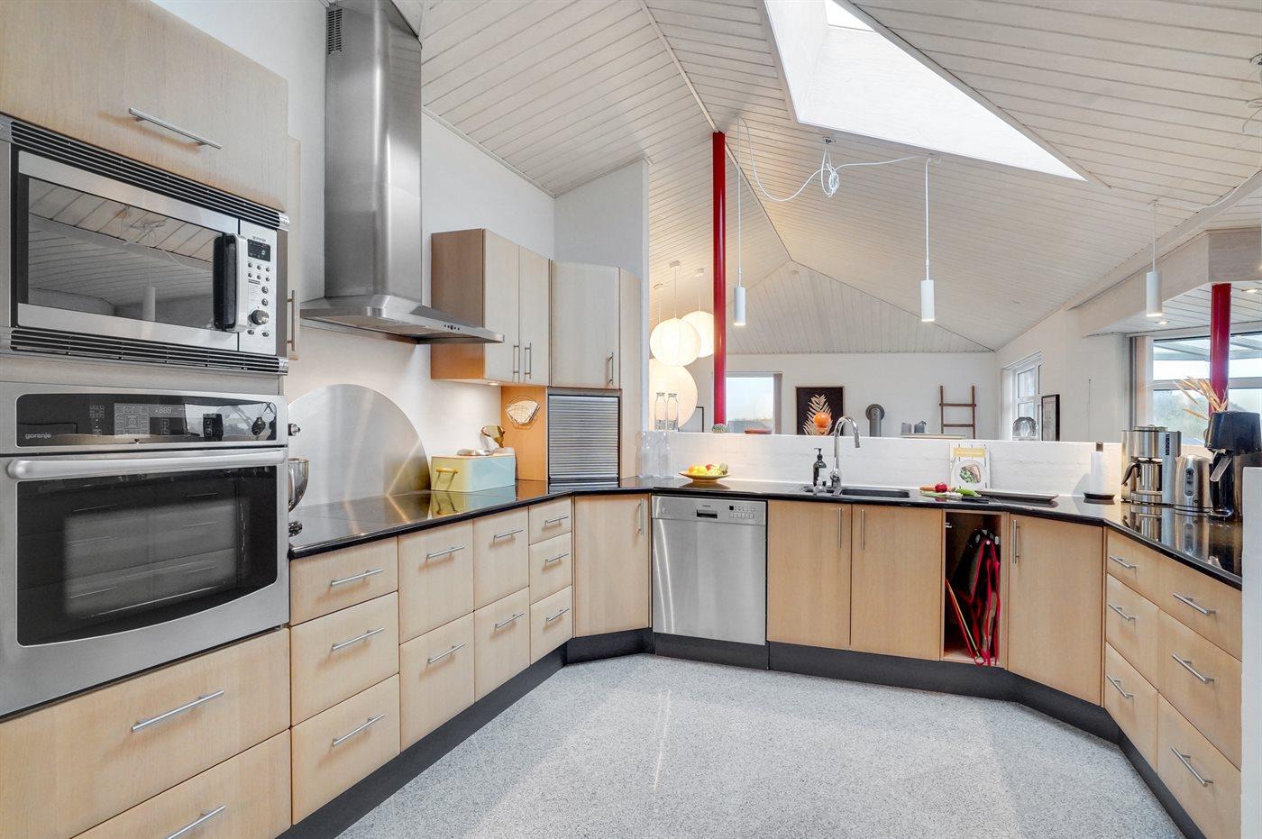 Køkkenet er udstyret med 1 køleskab. Der er 4 keramiske kogeplader, varmluftovn, mikrobølgeovn samt opvaskemaskine.