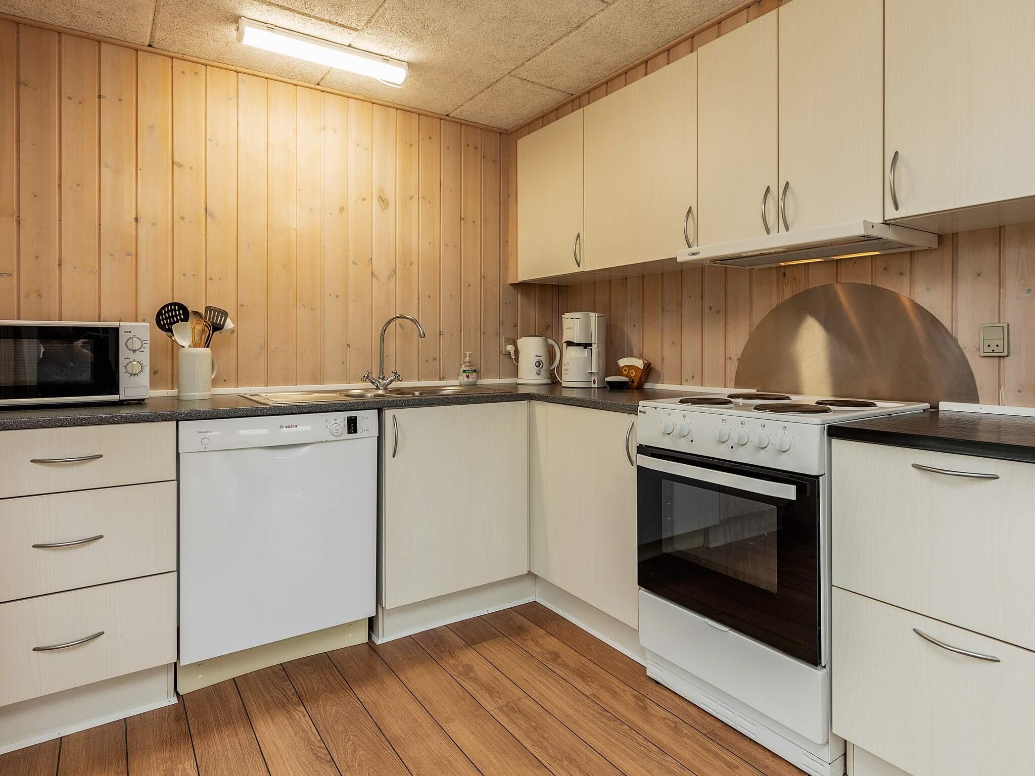 Køkken: Høj stol, el-komfur, køleskab m/frostboks, mikroovn, kaffemaskine, opvaskemask.