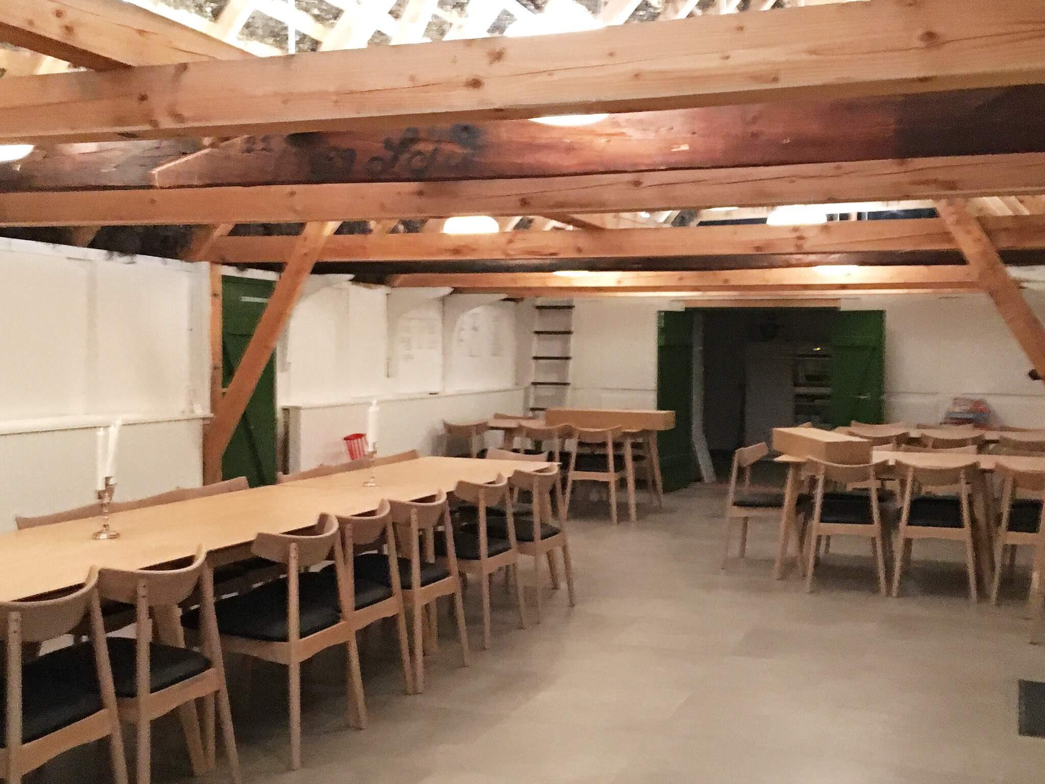 Den flotte sal i den gamle lade i tilknytning til hovedhuset er helt speciel med det indvendige synlige tangtag. I denne sal kan der være helt op til 30 personer og med de tilknyttede faciliteter som storskærm og køkken, betyder det, at i forbindelse med opholdet kan I invitere til arrangementer som dagsmøder, kursus og lignende. I salen er der AV-udstyr, 75” storskærm, whiteboard, printer og wifi + fibernet.