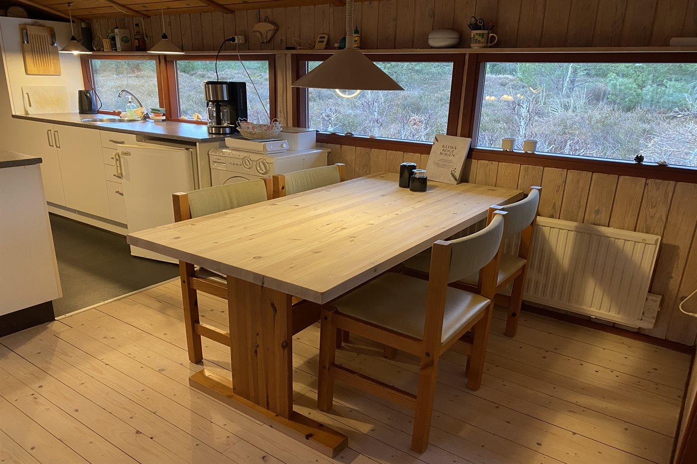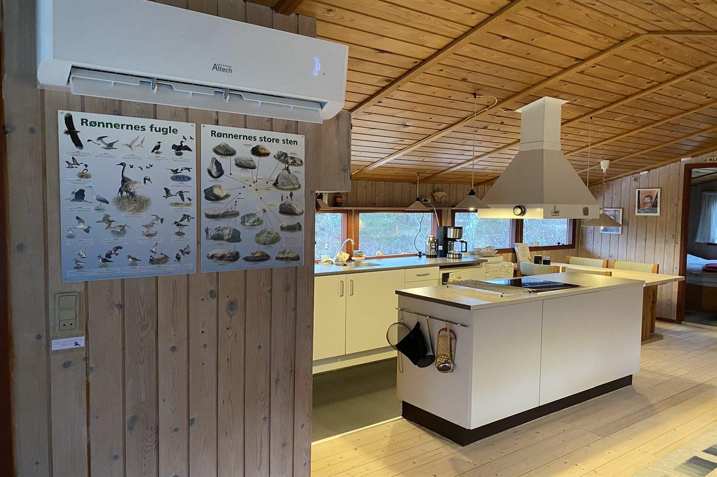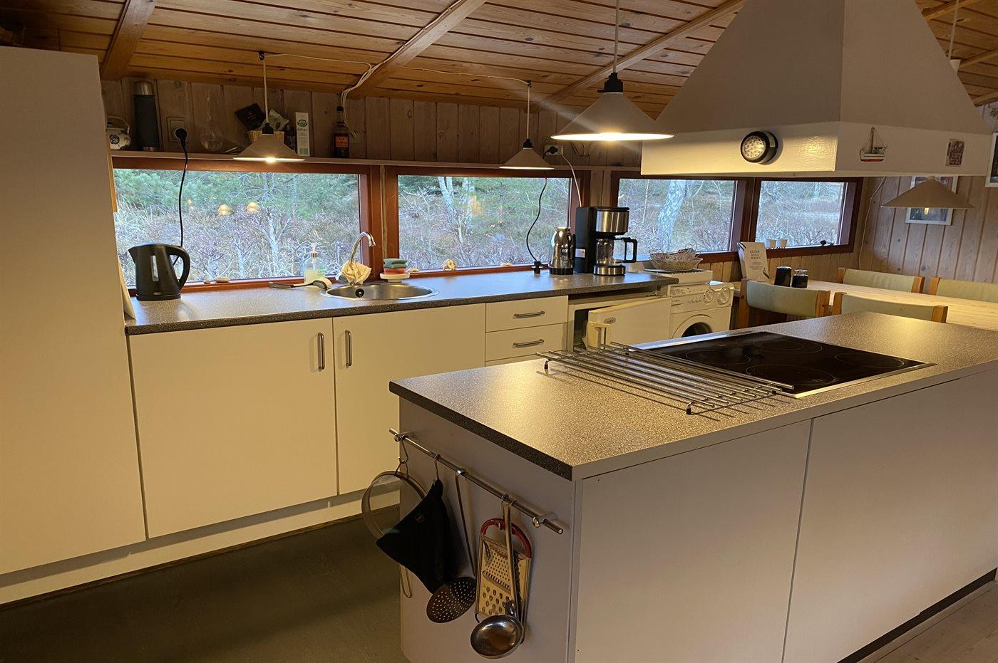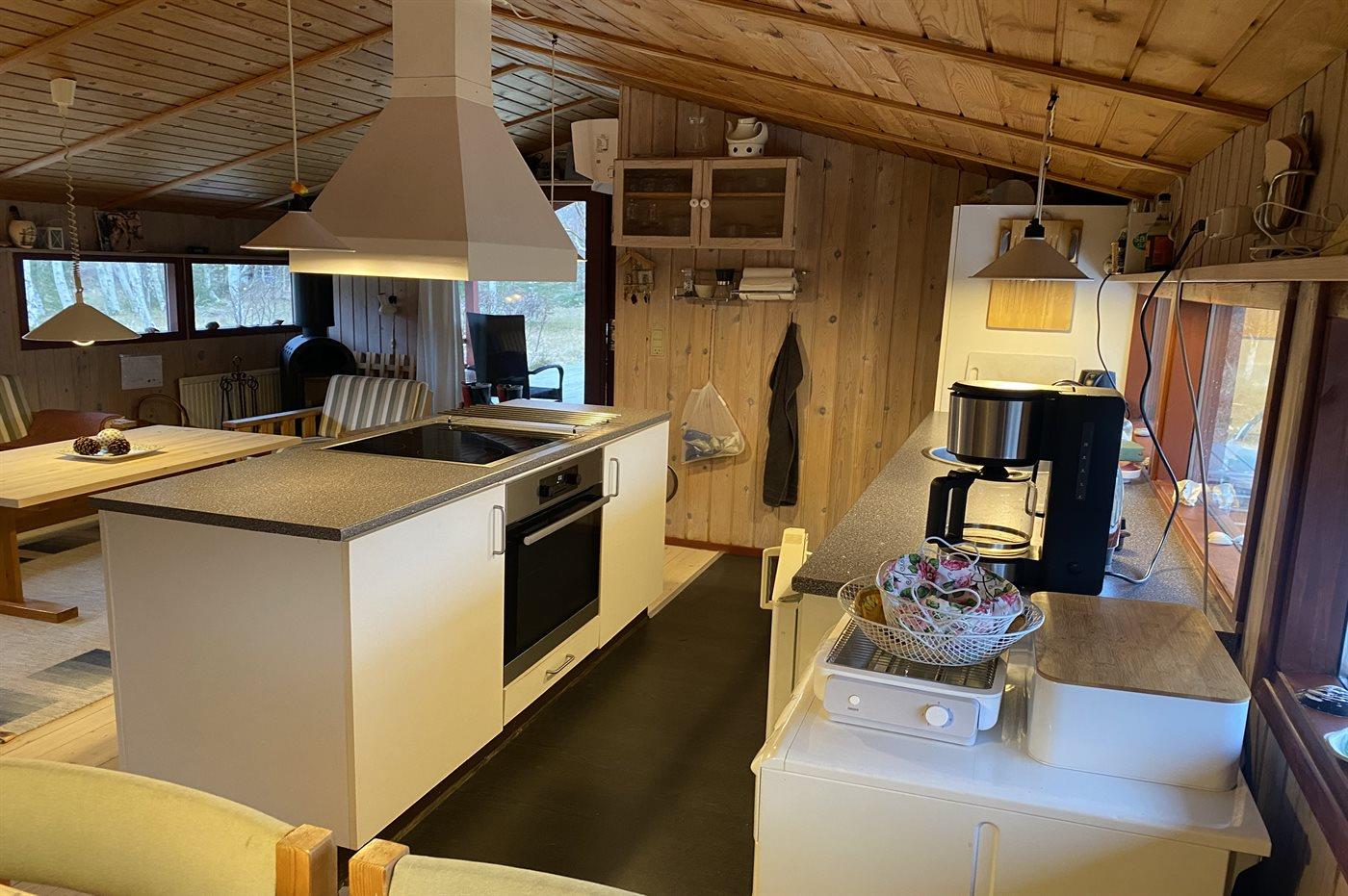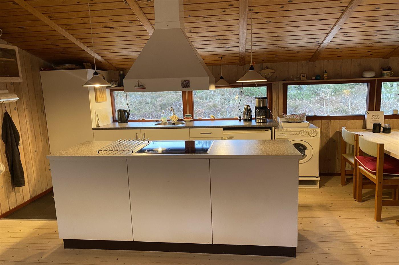 Køkkenet er udstyret med 1 køleskab. Der er 4 keramiske kogeplader, varmluftovn samt opvaskemaskine.