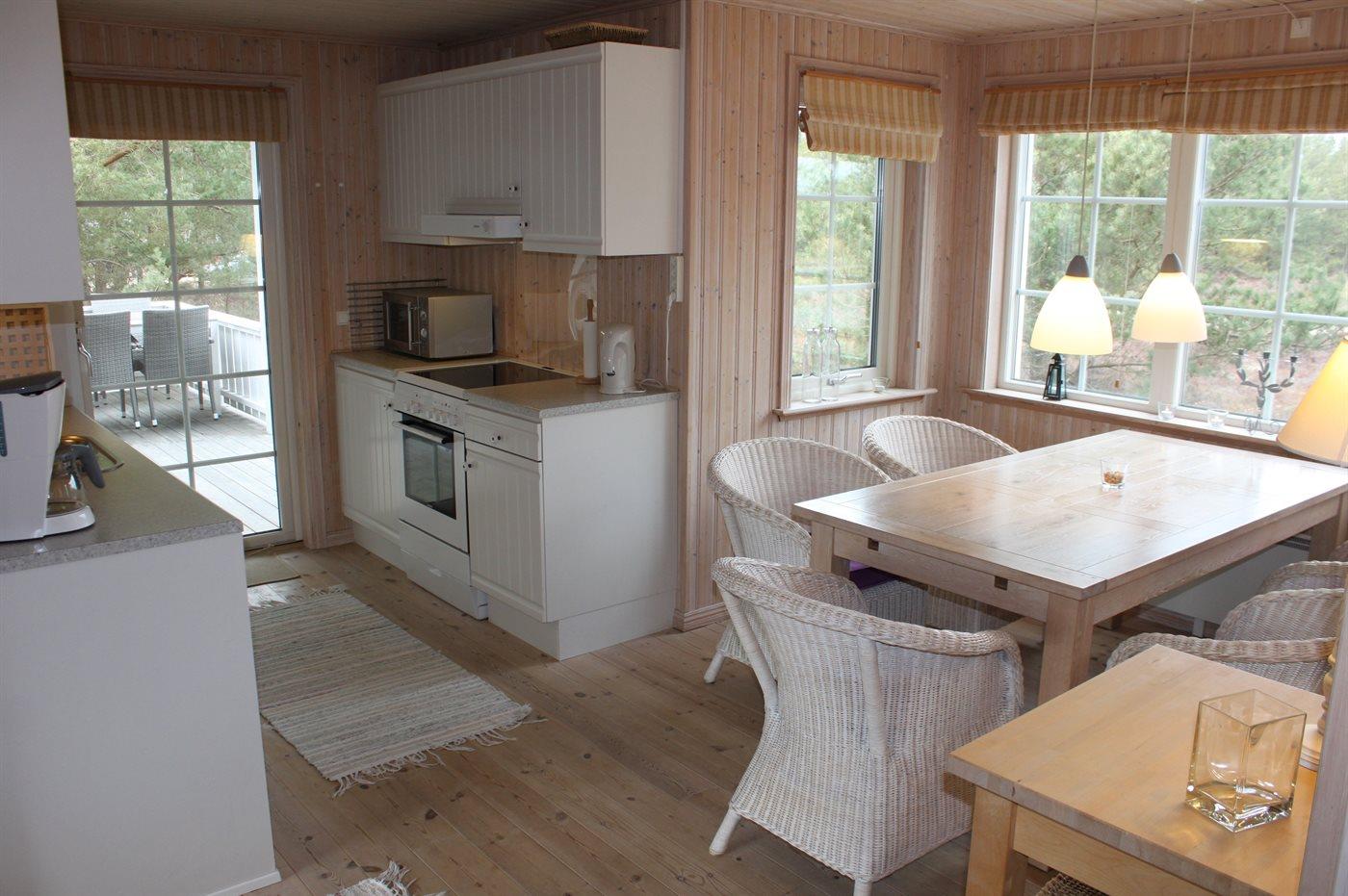 Køkkenet er udstyret med 1 køleskab. Der er 4 keramiske kogeplader, bageovn, mikrobølgeovn samt opvaskemaskine.