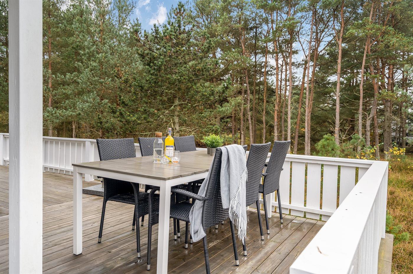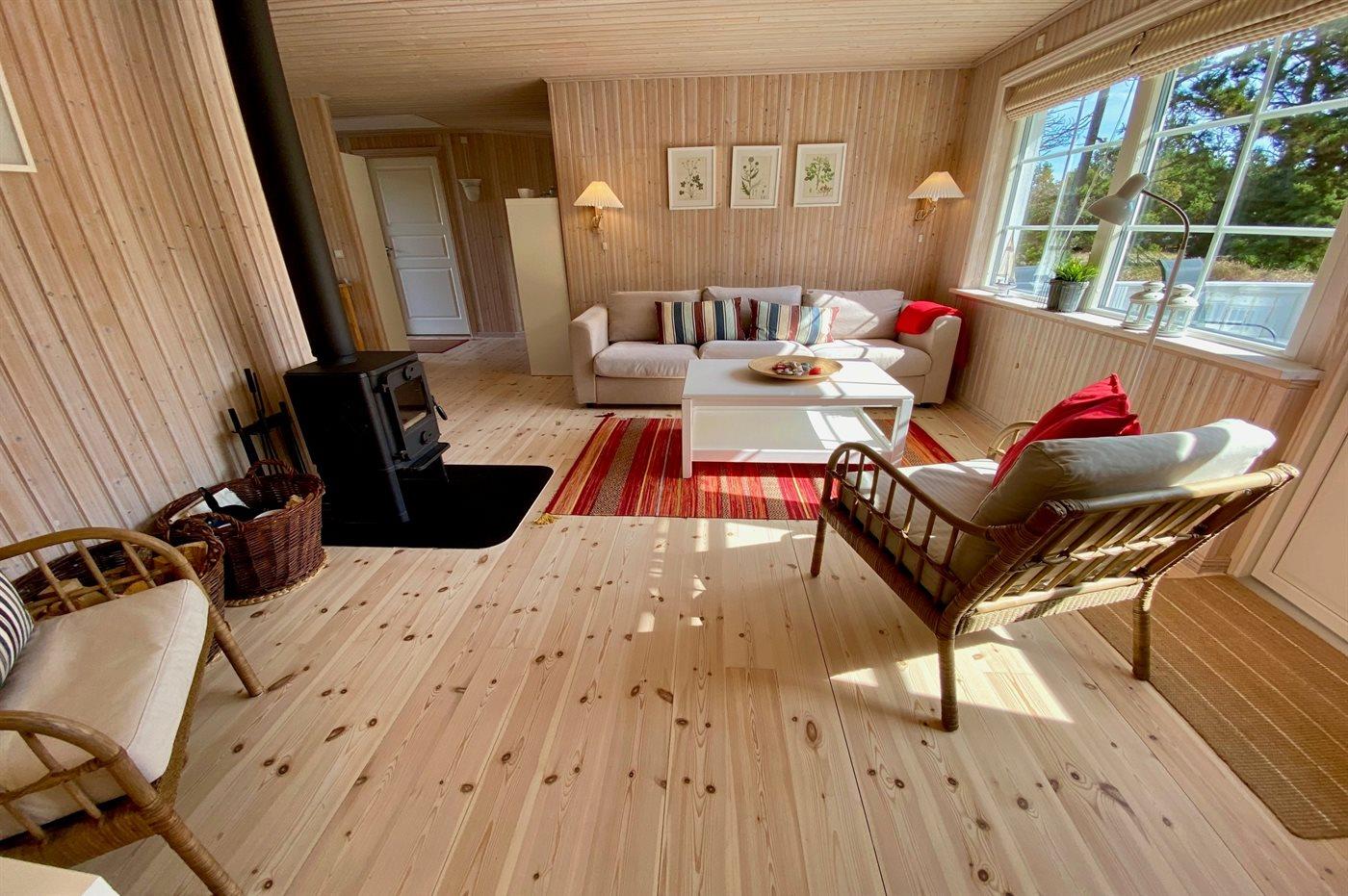 Hyggeligt svensk bjælkehus på Læsø med stor naturgrund, tæt på havet og golfbane, ideelt til afslappende ferie.