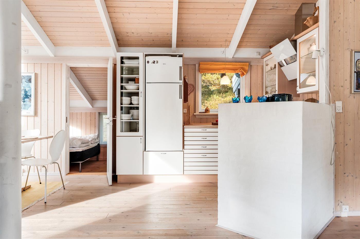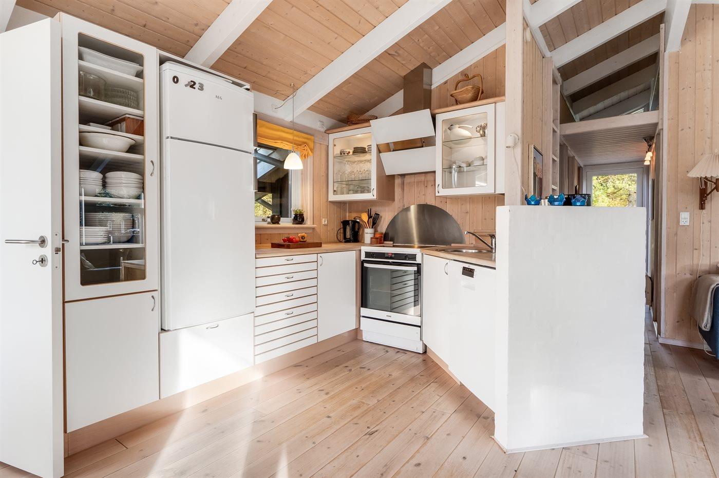 Køkkenet er udstyret med 1 køleskab. Der er 4 keramiske kogeplader, varmluftovn samt opvaskemaskine.