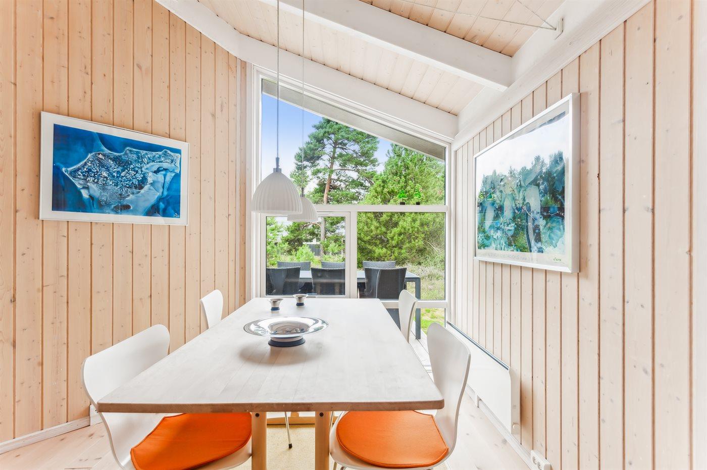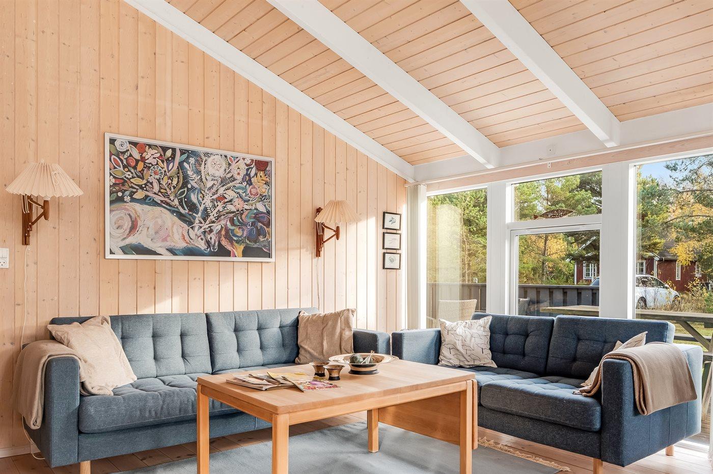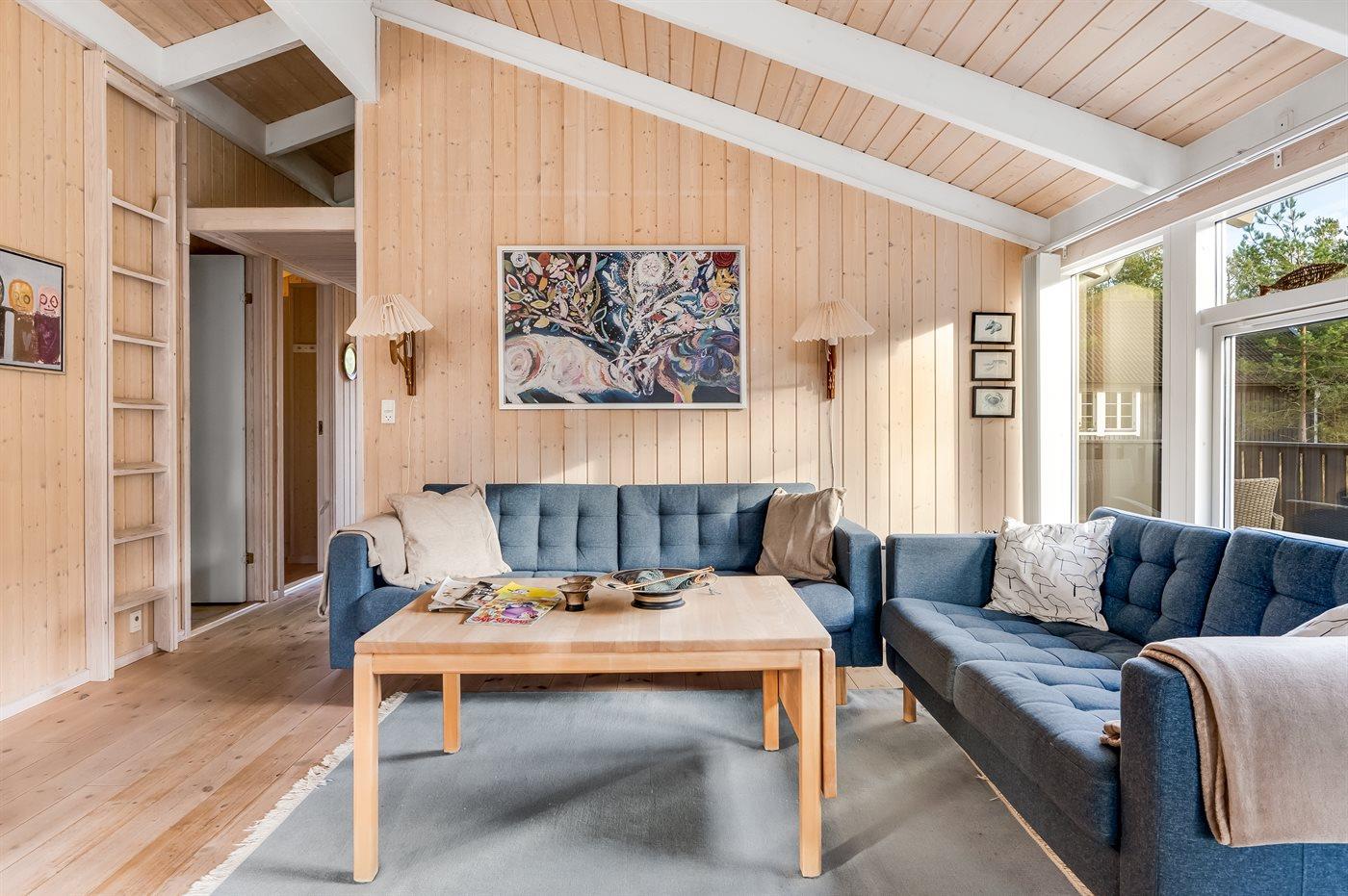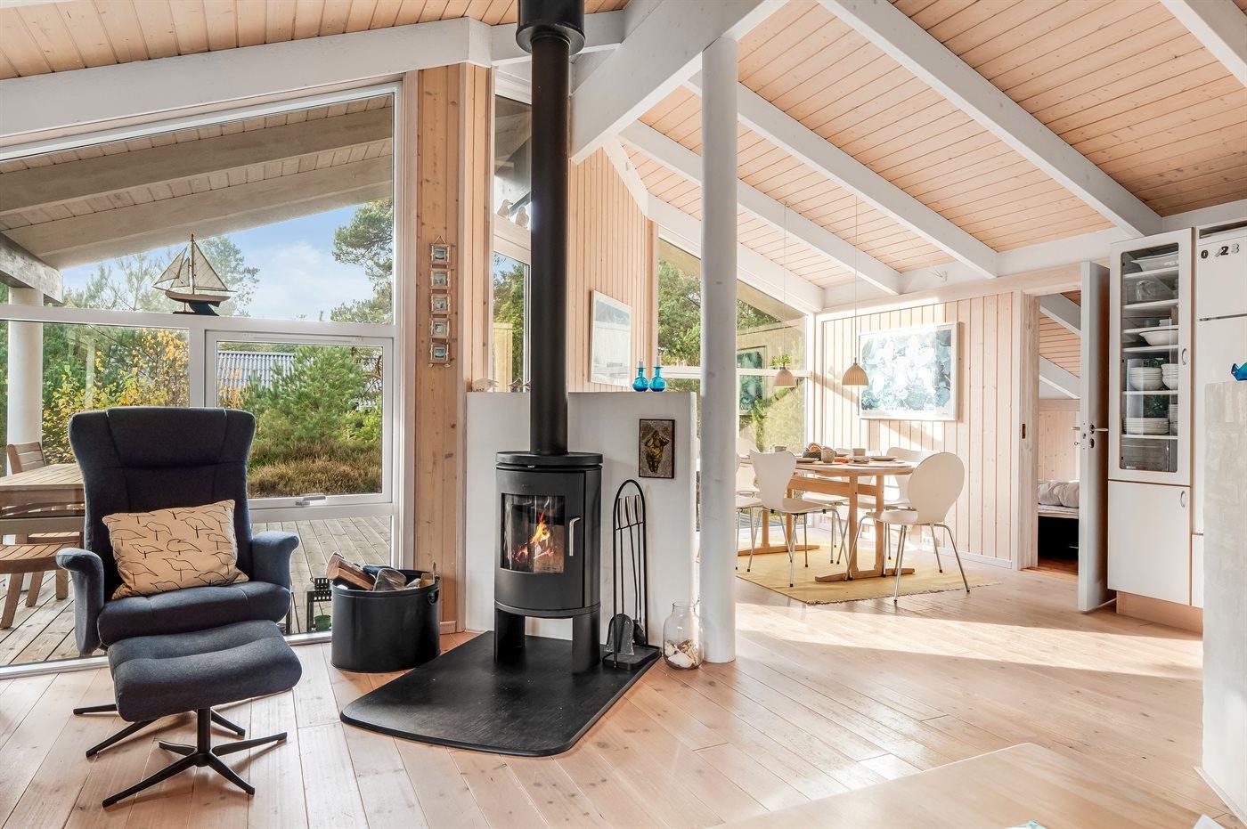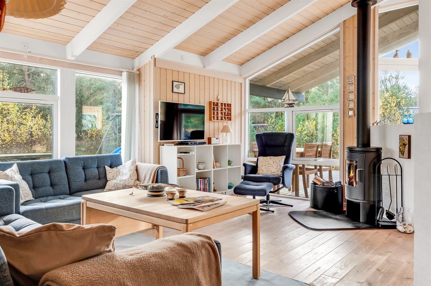 Med sin beliggenhed kun få meter til stranden er dette dejlige feriehus attraktiv året rundt. Det er optimalt indrettet, udstyret med flotte møbler og med en praktisk køkkenafdeling i tilslutning til den åbne stue.
