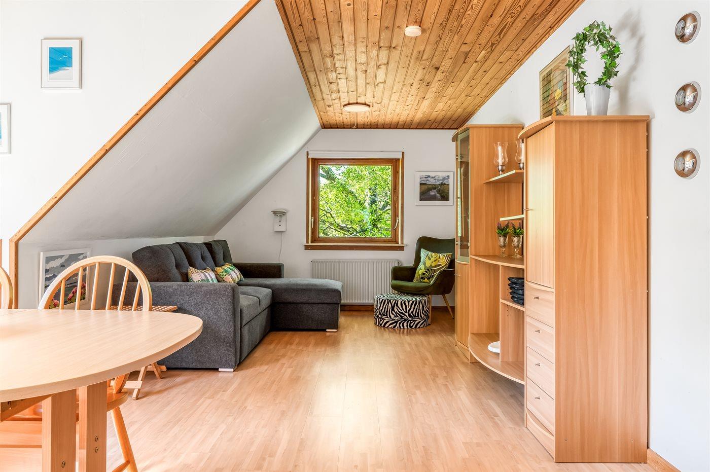 Bemærk, at sovepladsen på sovesofaen befinder sig i opholdsstuen på 1. sal.