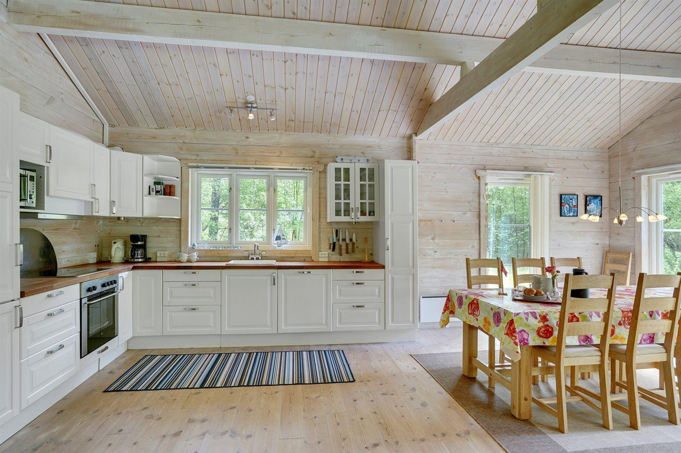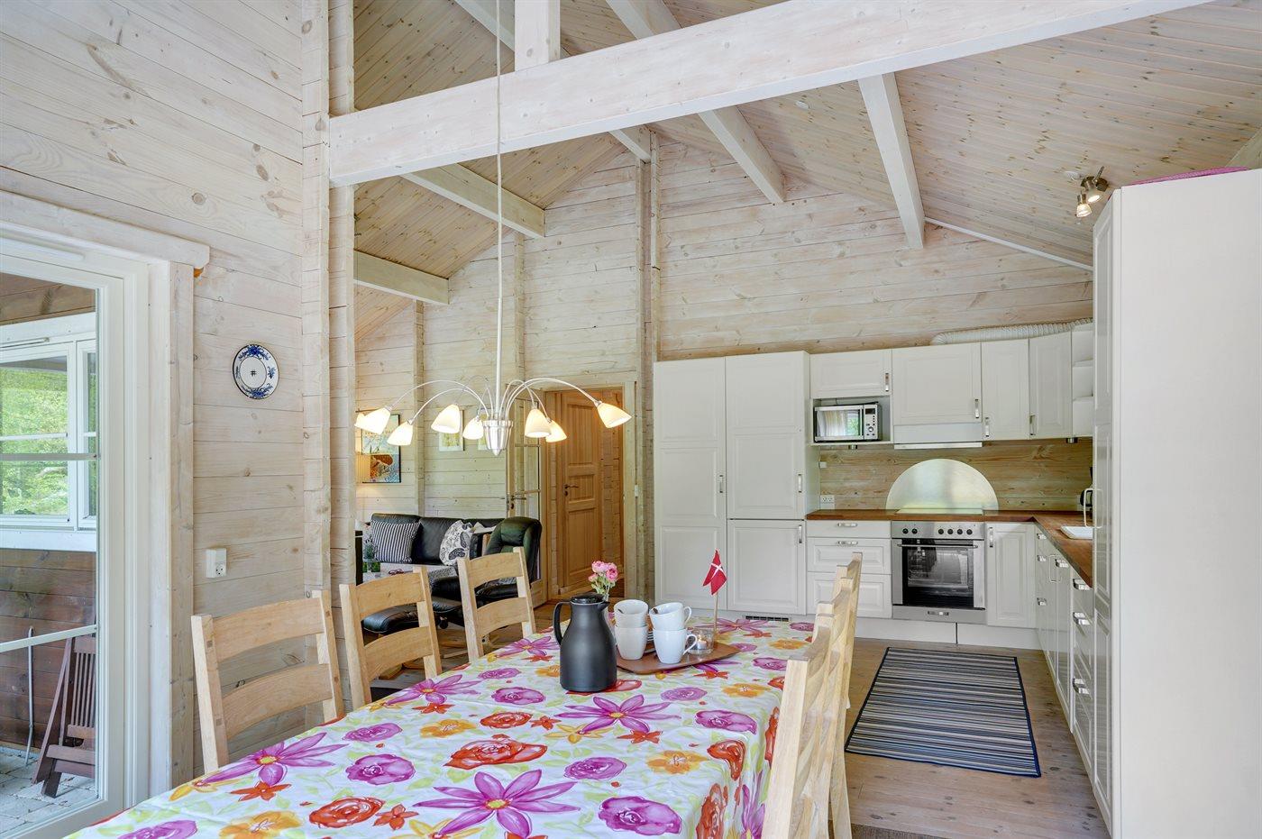 Køkkenet er udstyret med 1 køleskab. Der er 4 keramiske kogeplader, bageovn, mikrobølgeovn samt opvaskemaskine.