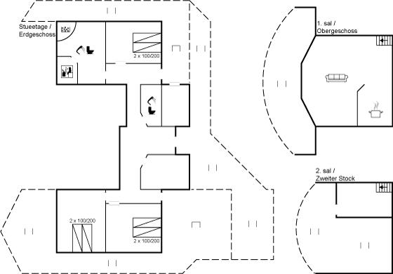 Der er i alt 3 soveværelser. Sovepladserne fordeler sig på: 4 sovepladser i dobbeltsenge. 2 sovepladser i enkeltsenge.