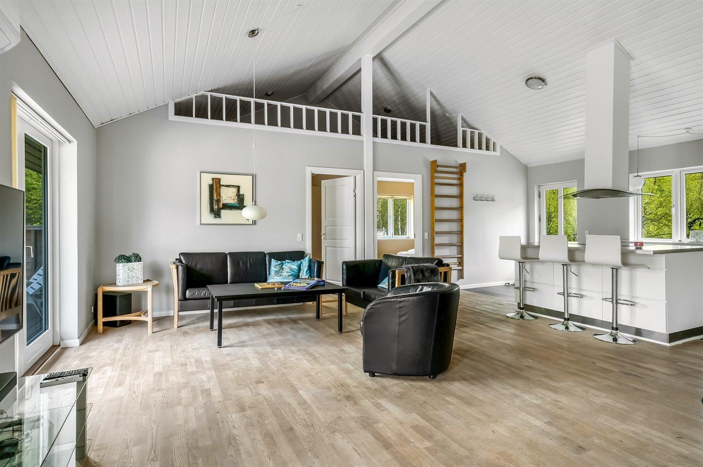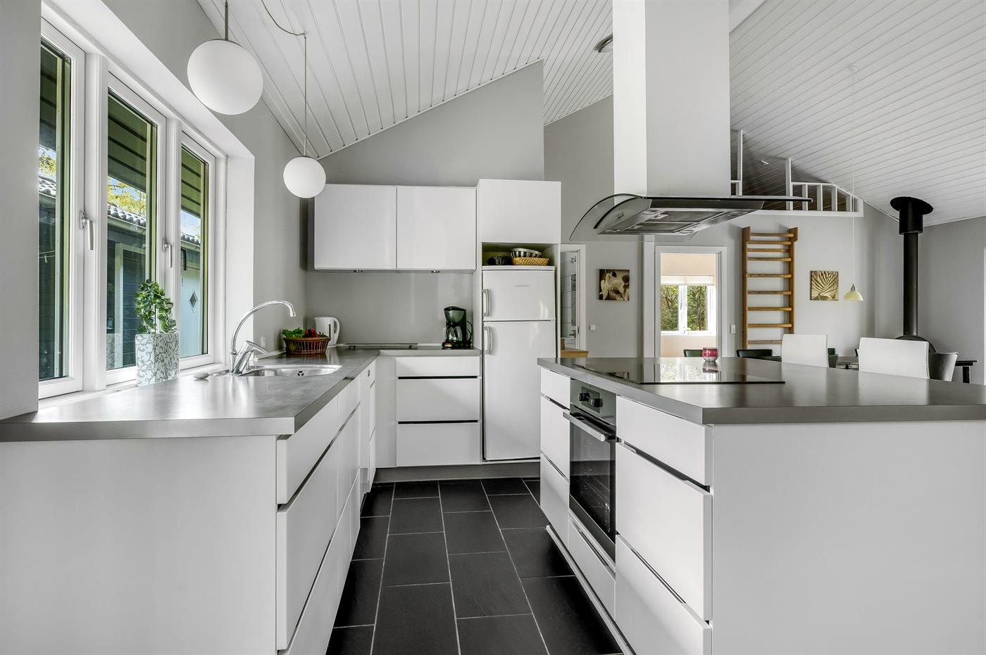 Køkkenet er udstyret med 1 køleskab. Der er 4 induktionskogeplader, varmluftovn, mikrobølgeovn samt opvaskemaskine.