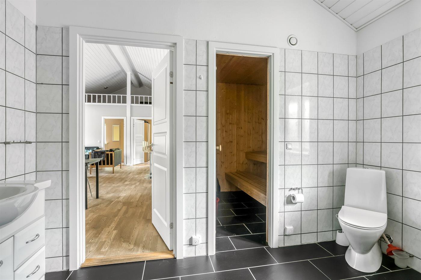 Der er 1 badeværelse med bruseniche og 1 toilet.. Der er gulvvarme på 1 badeværelse. I saunaen er der mulighed for afslapning.