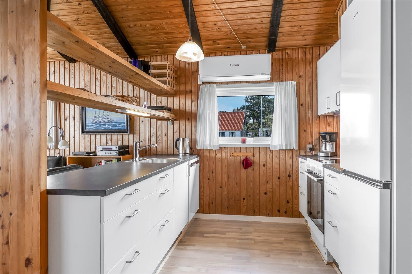 Køkkenet er udstyret med 1 køleskab. Der er 4 keramiske kogeplader, varmluftovn samt opvaskemaskine.