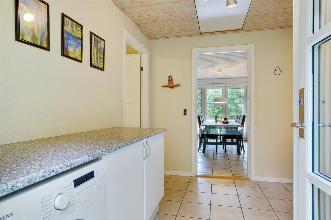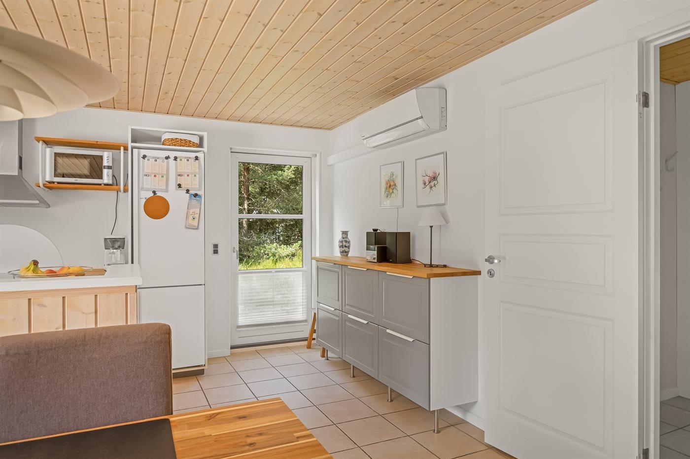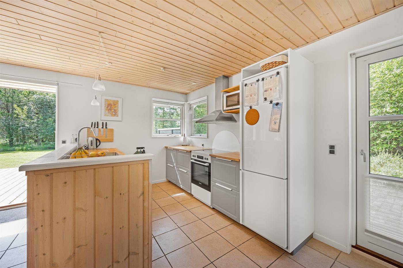 Køkkenet er udstyret med 1 køleskab. Der er 4 keramiske kogeplader, varmluftovn, mikrobølgeovn samt opvaskemaskine.