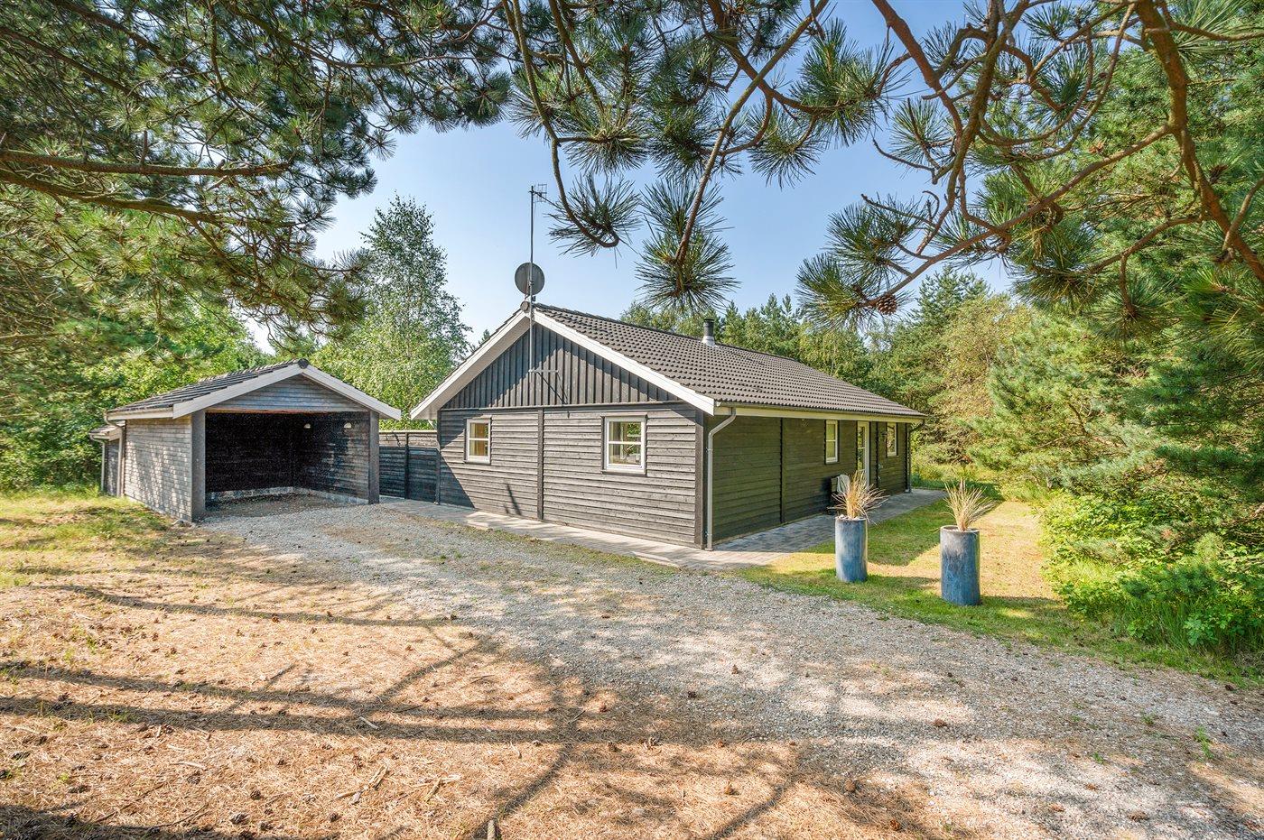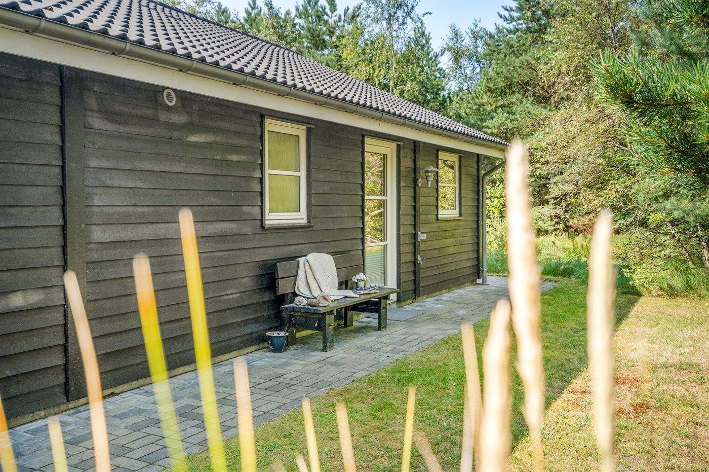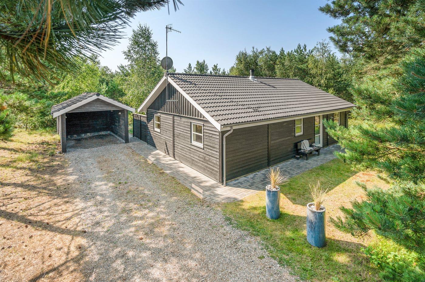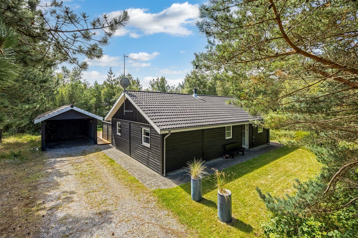 Ferieboligen er beliggende på en 1296 m² stor grund i skov/plantage. Grunden er indhegnet. Der er 350 m til havet. Nærmeste forretning er beliggende i en afstand af 1000 m. Til ferieboligen hører 112 m² terrasseareal. Grill til rådighed. Der er carport til rådighed. Parkering ved ferieboligen.