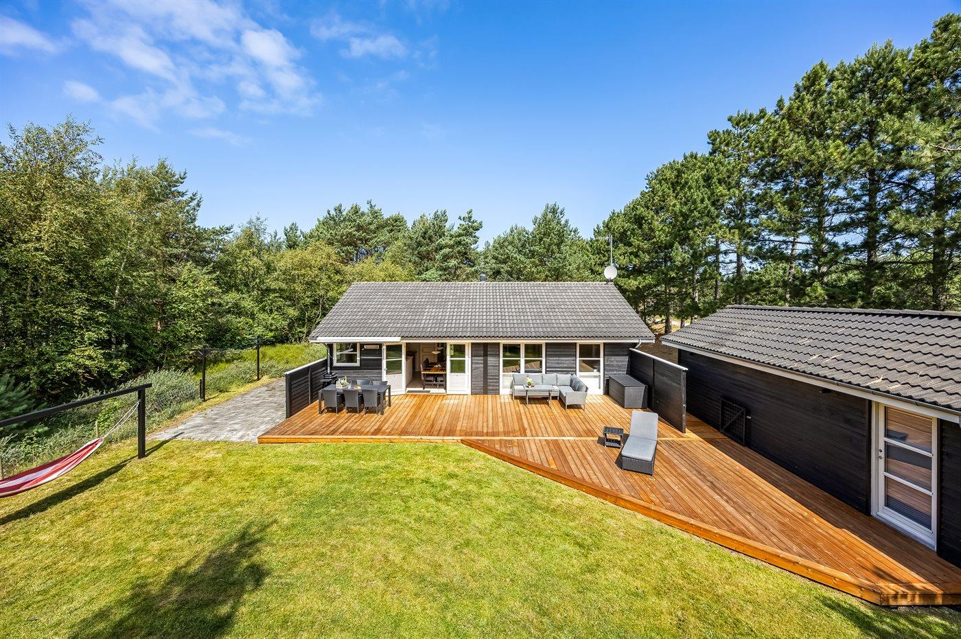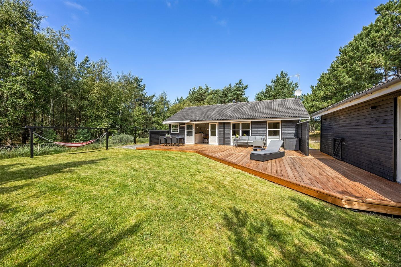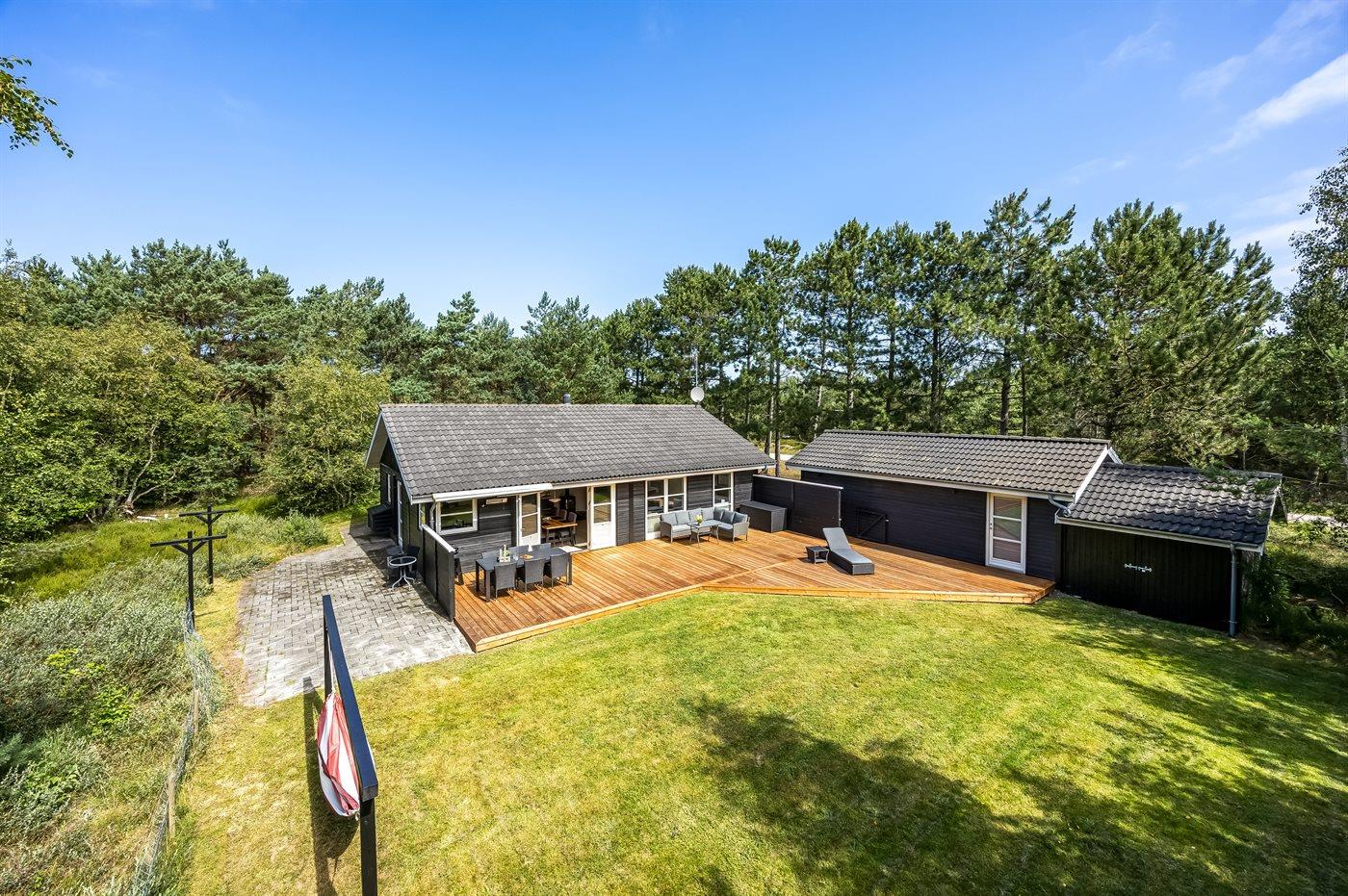 Ferieboligen er beliggende på en 1296 m² stor grund i skov/plantage. Grunden er indhegnet. Der er 350 m til havet. Nærmeste forretning er beliggende i en afstand af 1000 m. Til ferieboligen hører 112 m² terrasseareal. Grill til rådighed. Der er carport til rådighed. Parkering ved ferieboligen.