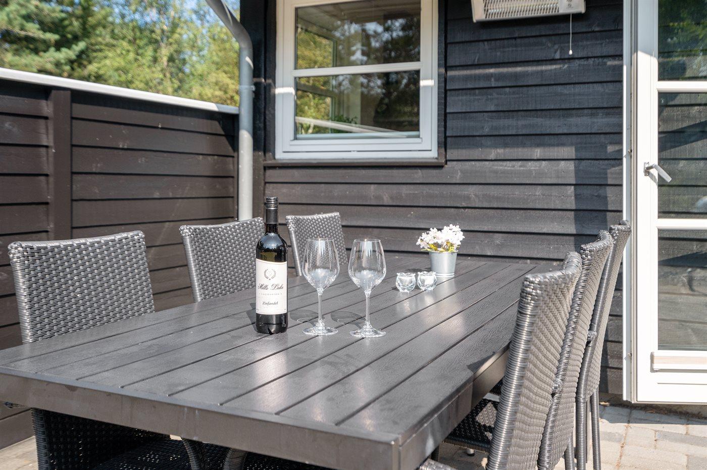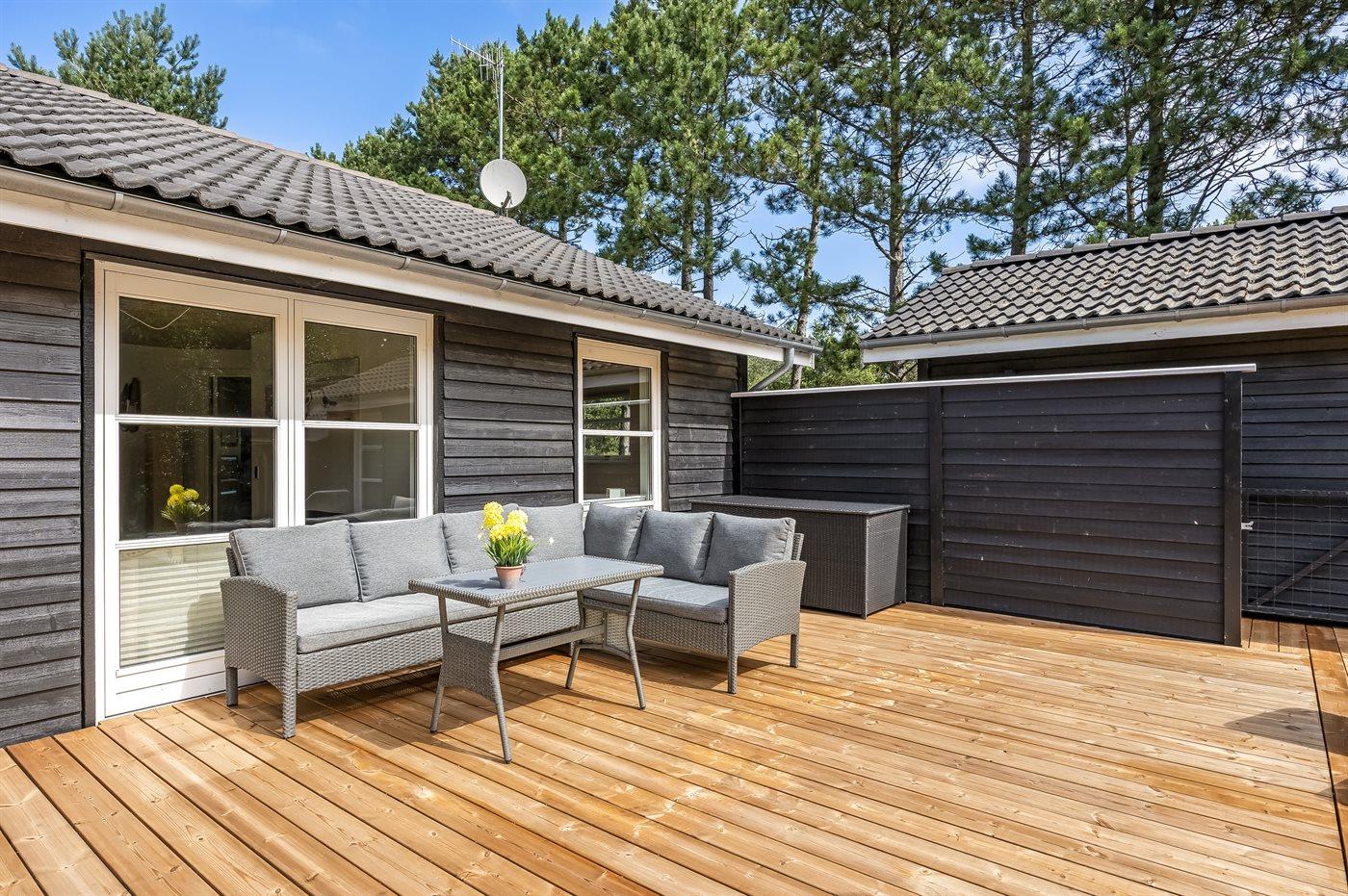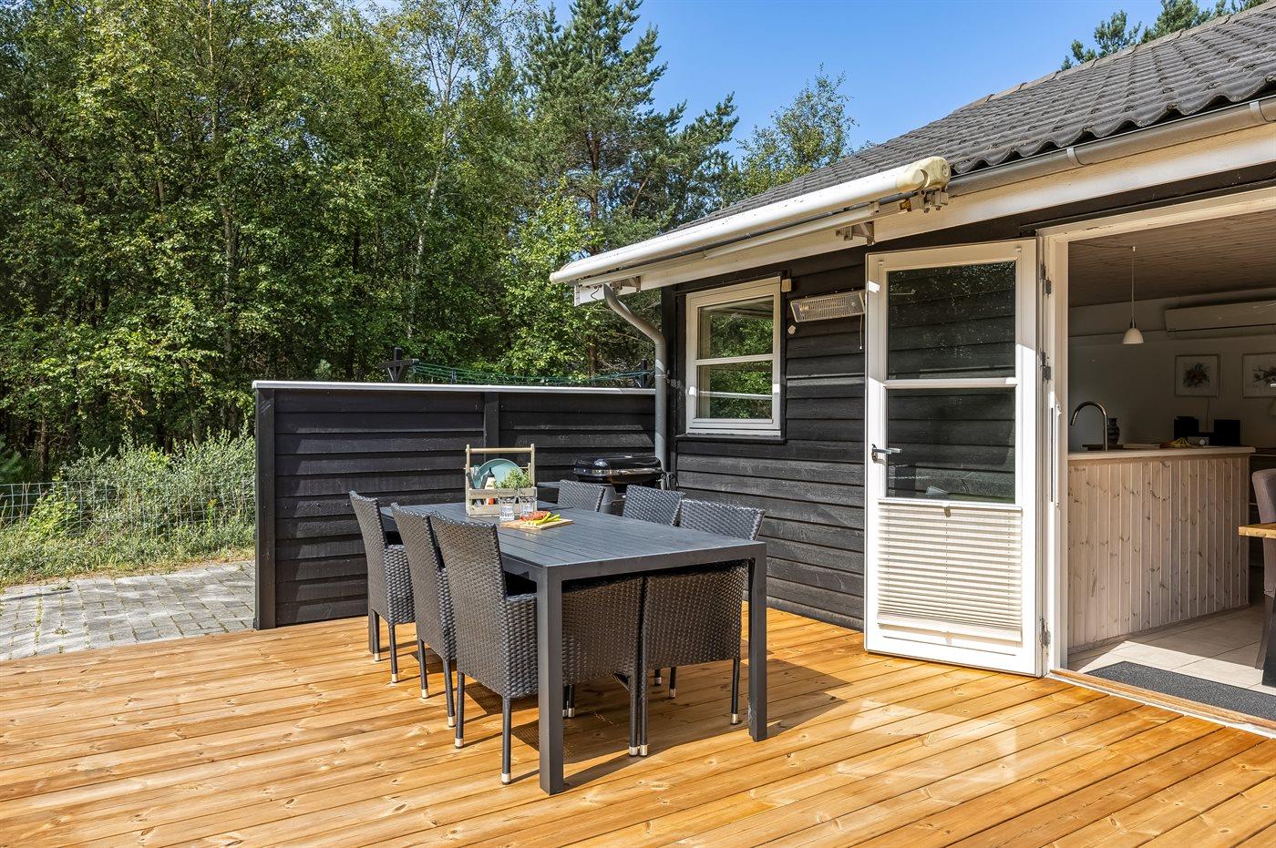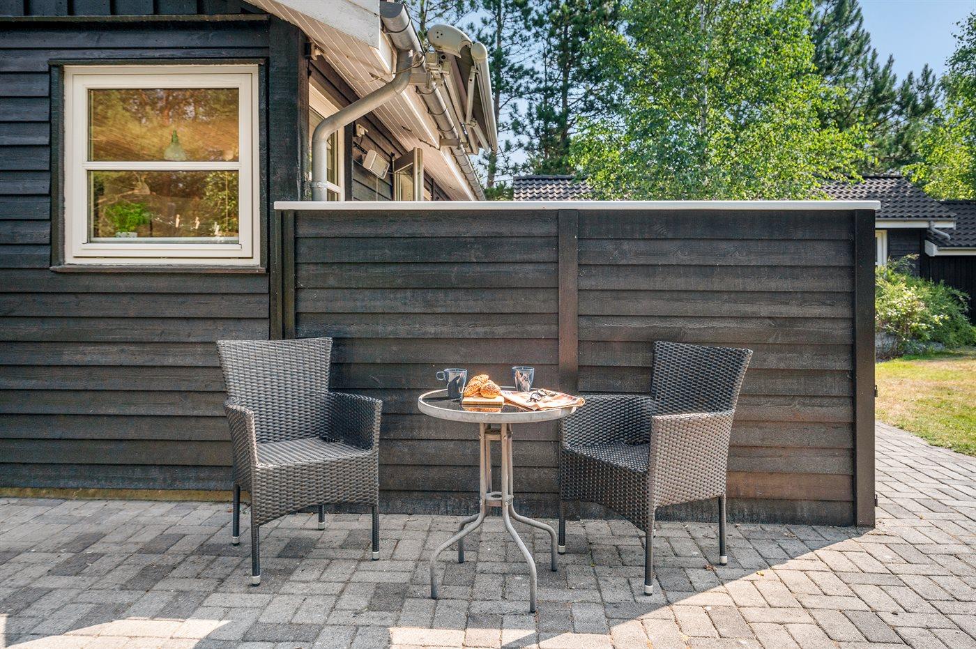 Ferieboligen er beliggende på en 1296 m² stor grund i skov/plantage. Grunden er indhegnet. Der er 350 m til havet. Nærmeste forretning er beliggende i en afstand af 1000 m. Til ferieboligen hører 112 m² terrasseareal. Grill til rådighed. Der er carport til rådighed. Parkering ved ferieboligen.
