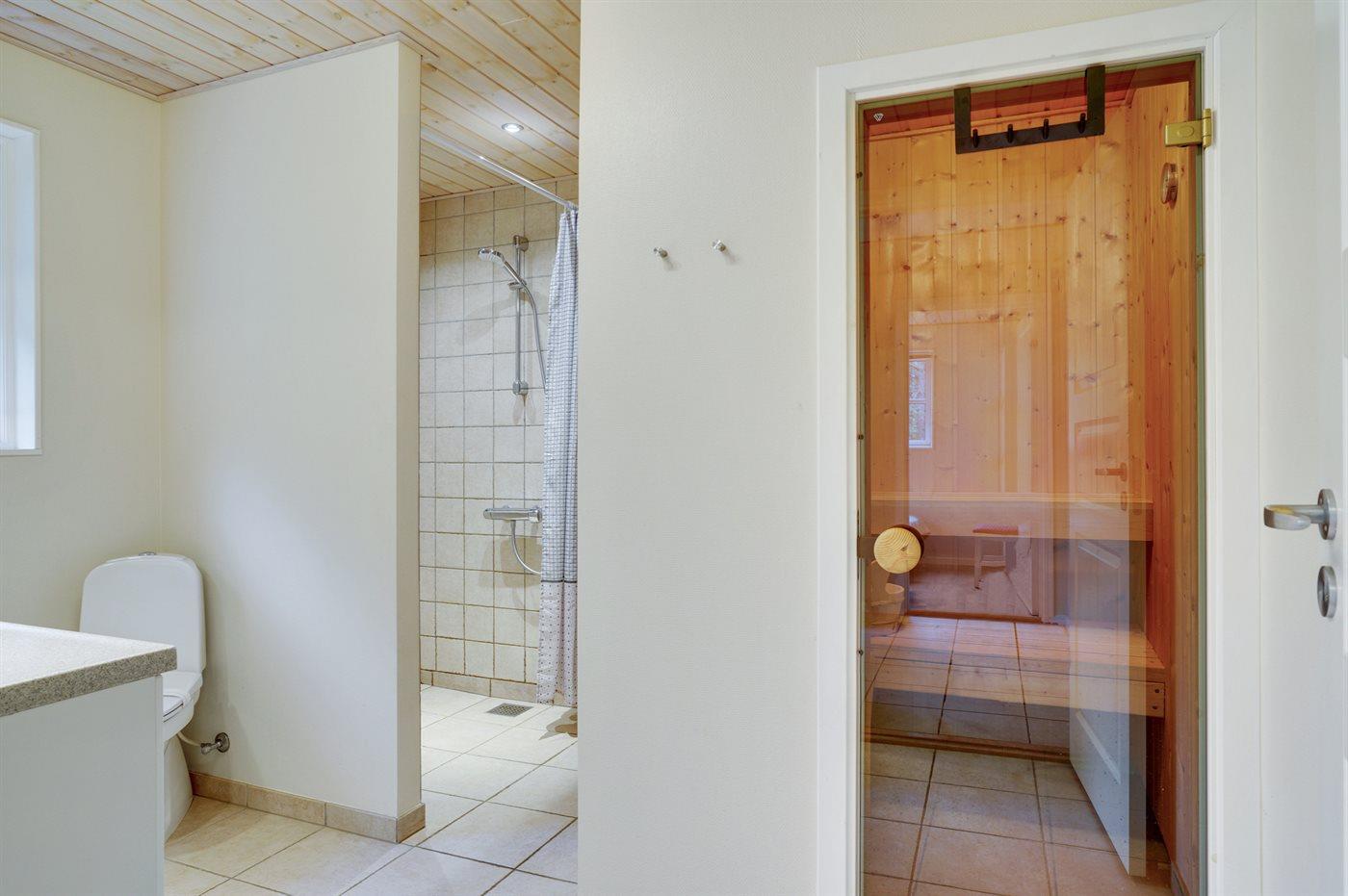 Der er 1 badeværelse med bruseniche og 1 toilet.. Der er gulvvarme på 1 badeværelse. I saunaen er der mulighed for afslapning.