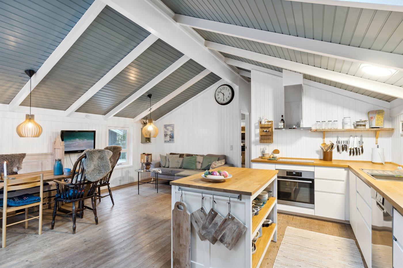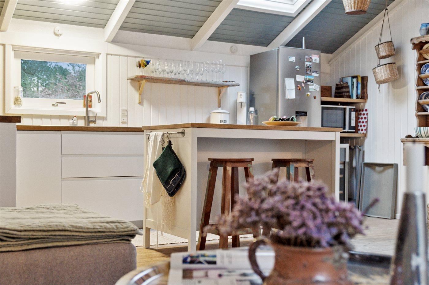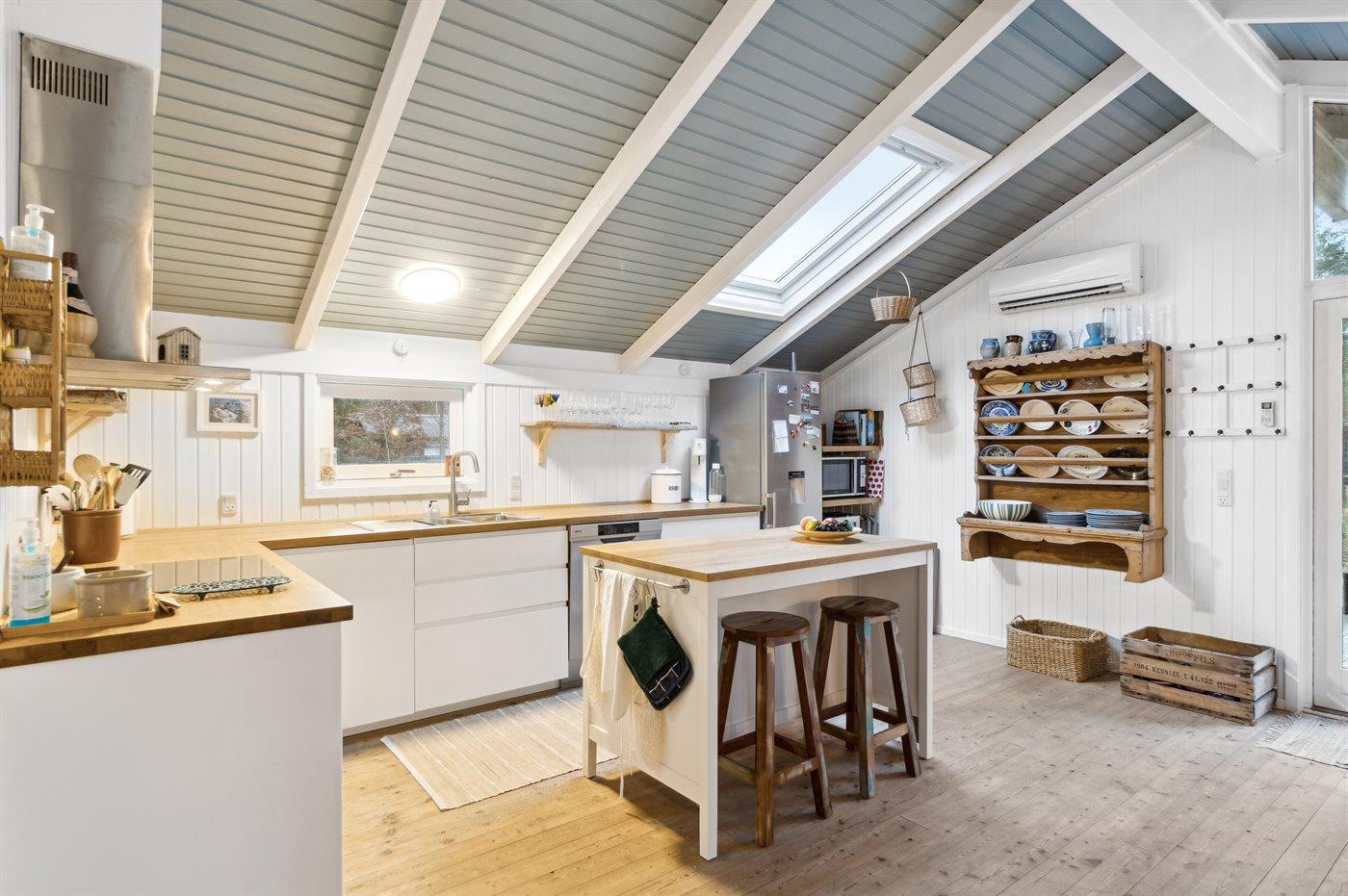 Køkkenet er udstyret med 1 køleskab. Der er 4 keramiske kogeplader, varmluftovn, mikrobølgeovn samt opvaskemaskine.