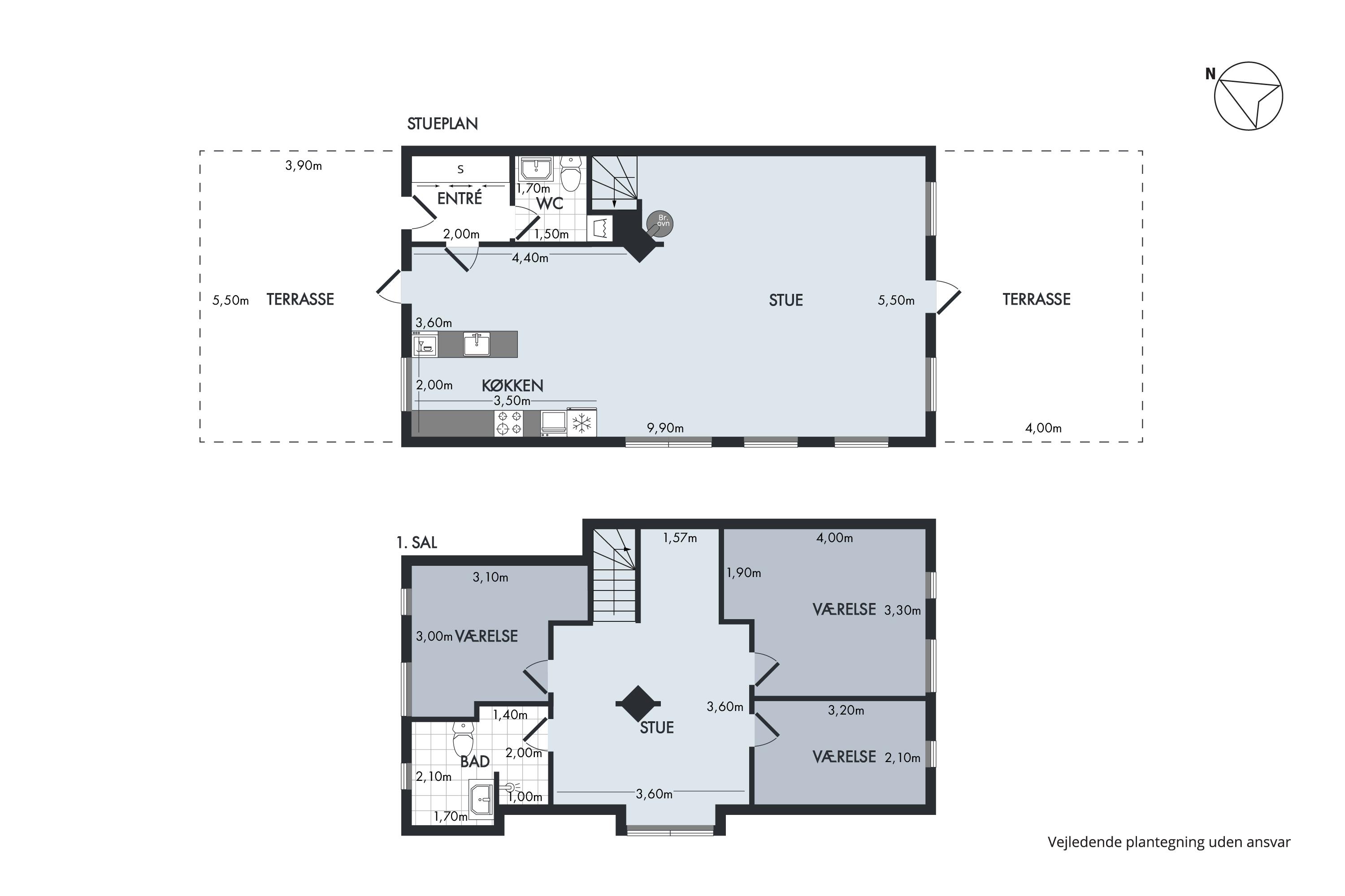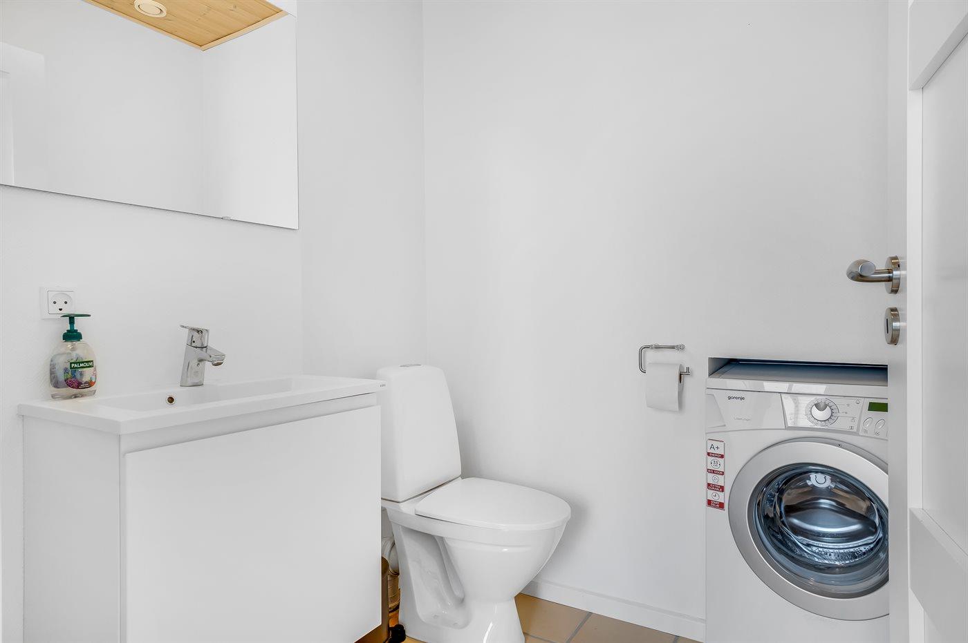 Der er 1 badeværelse med bruseniche og 2 toiletter, heraf 1 gæstetoilet. Der er gulvvarme på 1 badeværelse. Der er gulvvarme på gæstetoilettet.