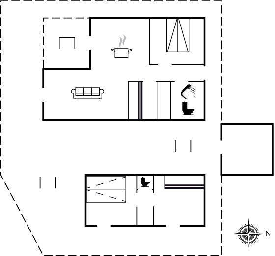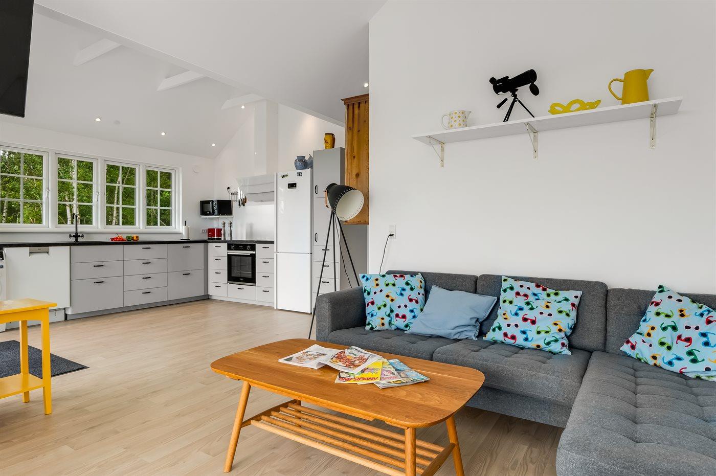 Huset består af sammenhængende stue og køkken, 1 badeværelse med bruseniche og gulvvarme, 1 soveværelse med dobbeltseng og 1 værelse med 4 køjesenge.