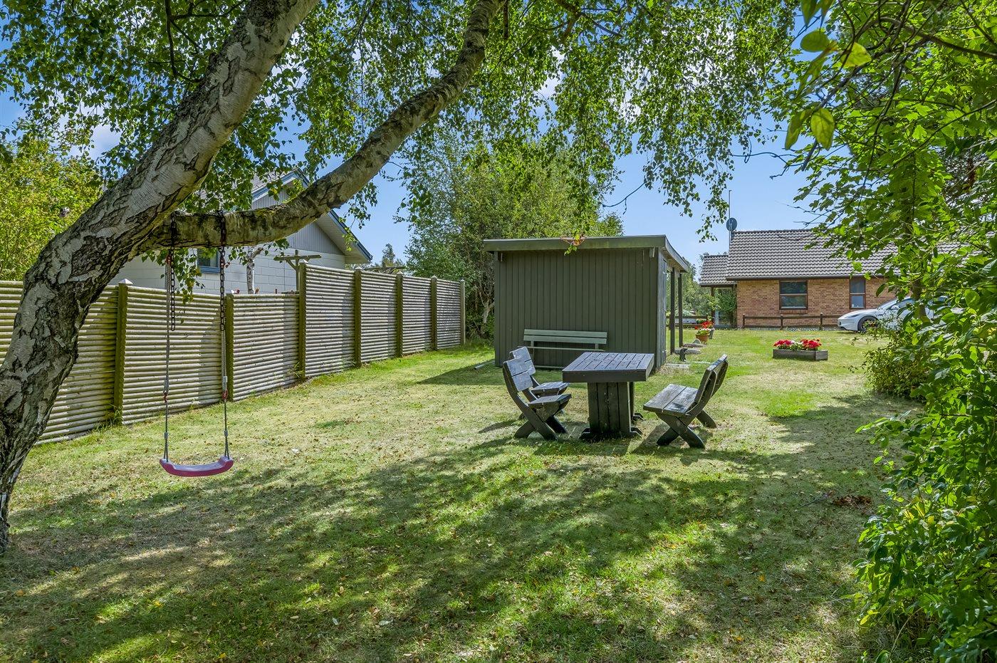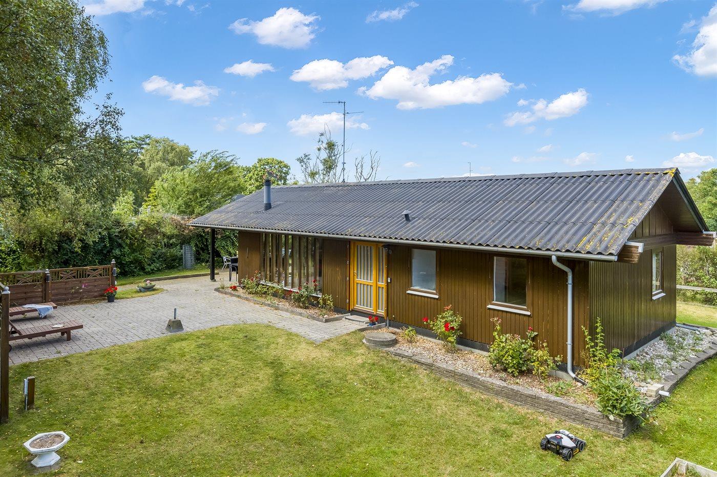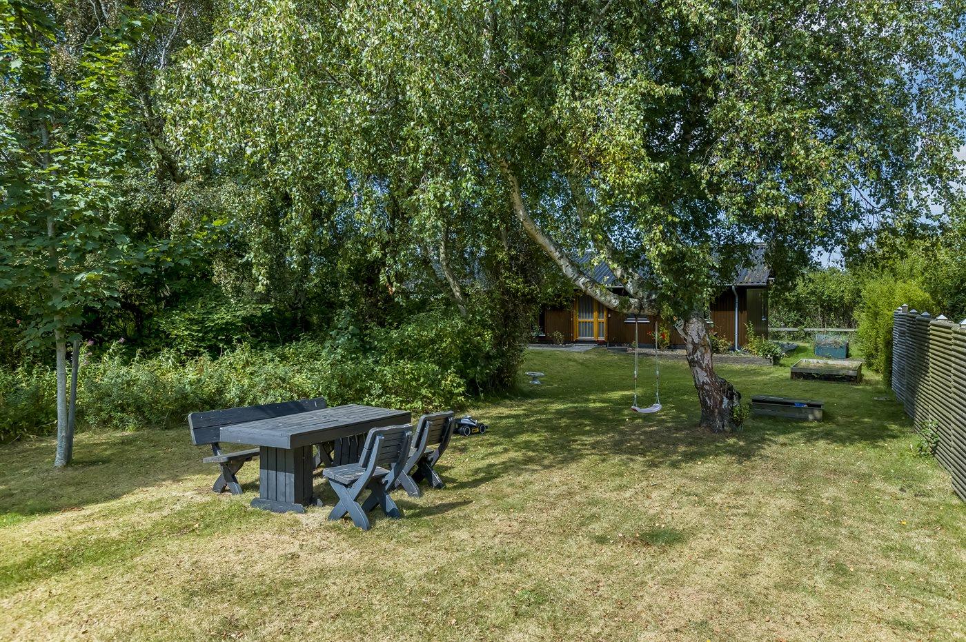 Sommerhuset er beliggende på en stor, sydvendt grund med fin bevoksning. Her kan du hurtigt snuppe badehåndklædet, tage ned til stranden og få dig en dukkert ved lystbådehavnen.