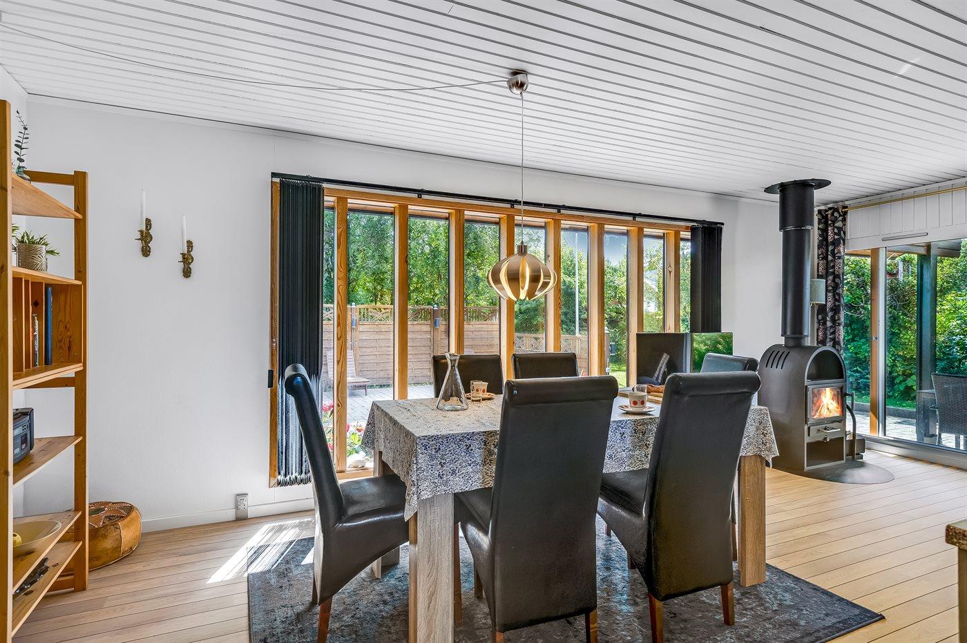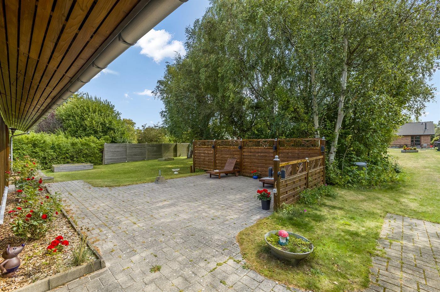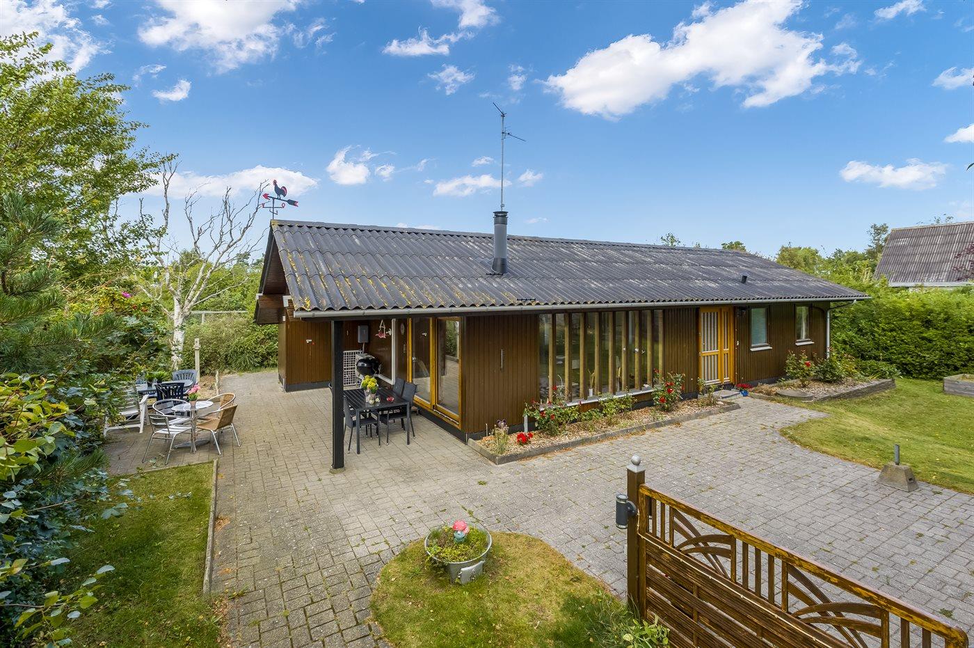 Sommerhuset er beliggende på en stor, sydvendt grund med fin bevoksning. Her kan du hurtigt snuppe badehåndklædet, tage ned til stranden og få dig en dukkert ved lystbådehavnen.