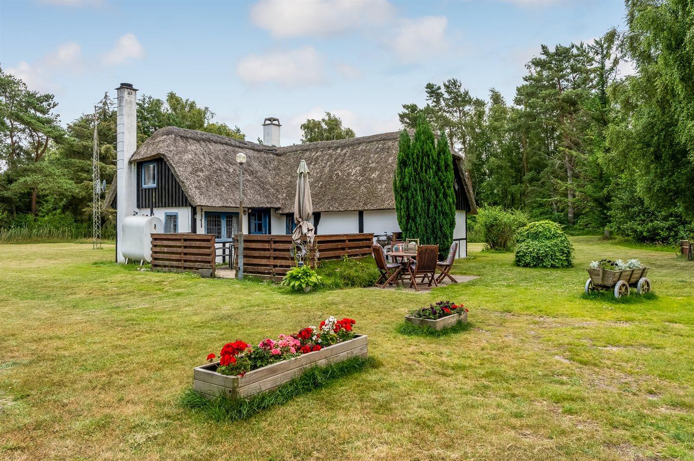 Et charmerende sommerhus med stråtag, beliggende helt ugenert i naturskønne omgivelser, på en stor græsgrund med træer. Der er ikke langt til øens flotte badestrand ”Danzigmann”, skov med mulighed for lange gåture og havnemiljøet.