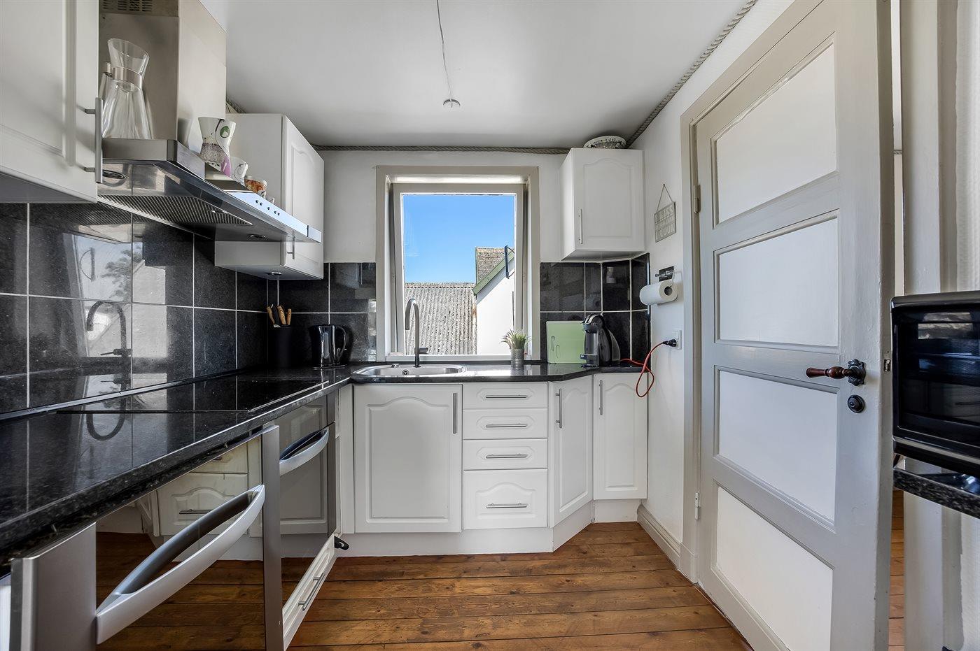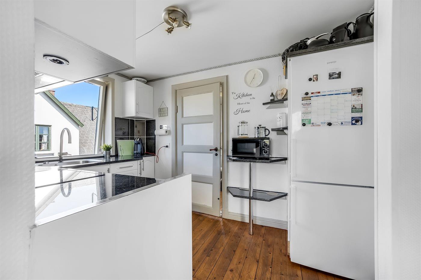 Køkkenet er udstyret med 1 køleskab. Der er 4 keramiske kogeplader, varmluftovn, mikrobølgeovn samt opvaskemaskine.