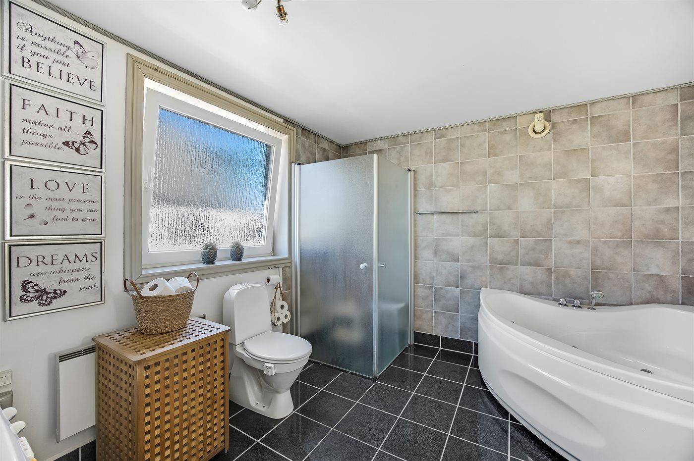 Der er 1 badeværelse med bruseniche og 1 toilet.. Der er gulvvarme på 1 badeværelse.. Badekar.