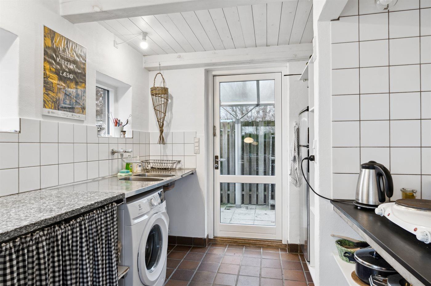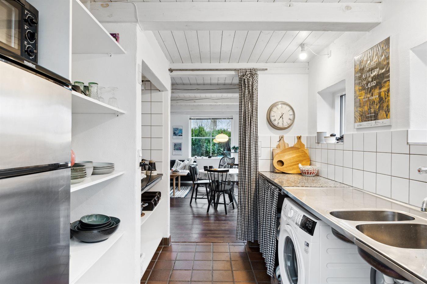 Køkkenet er udstyret med 1 køleskab. Der er 2 elkogeplader og miniovn. Der er gulvvarme i køkkenet.
