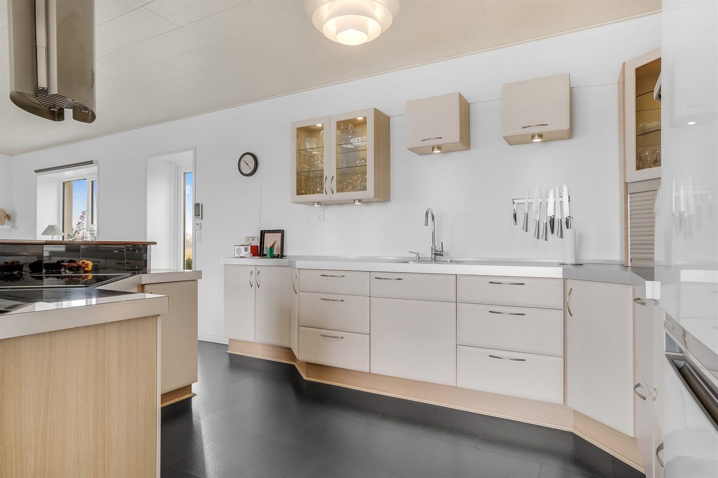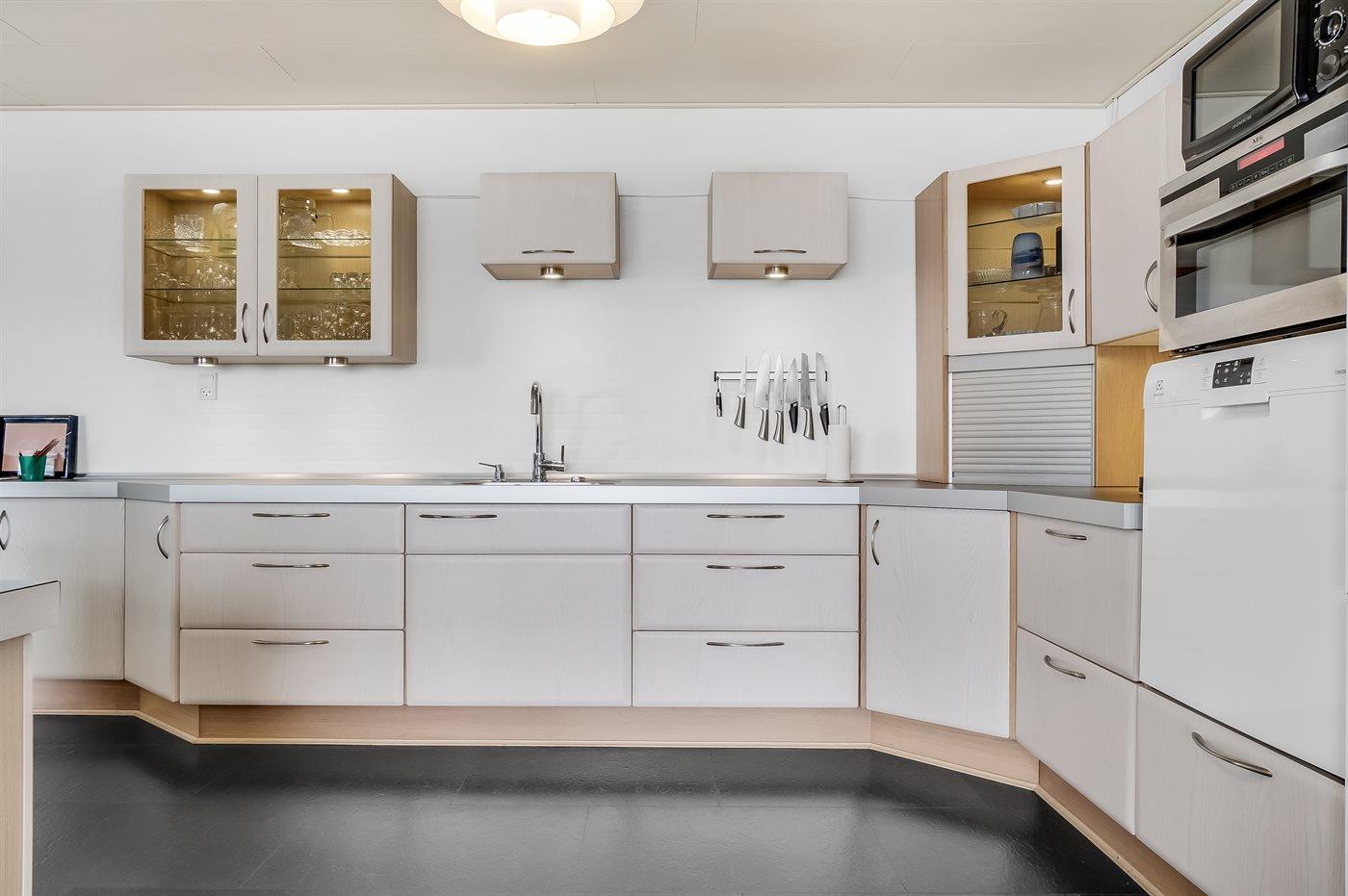 Køkkenet er udstyret med 1 køleskab. Der er 4 keramiske kogeplader, varmluftovn, mikrobølgeovn samt opvaskemaskine.