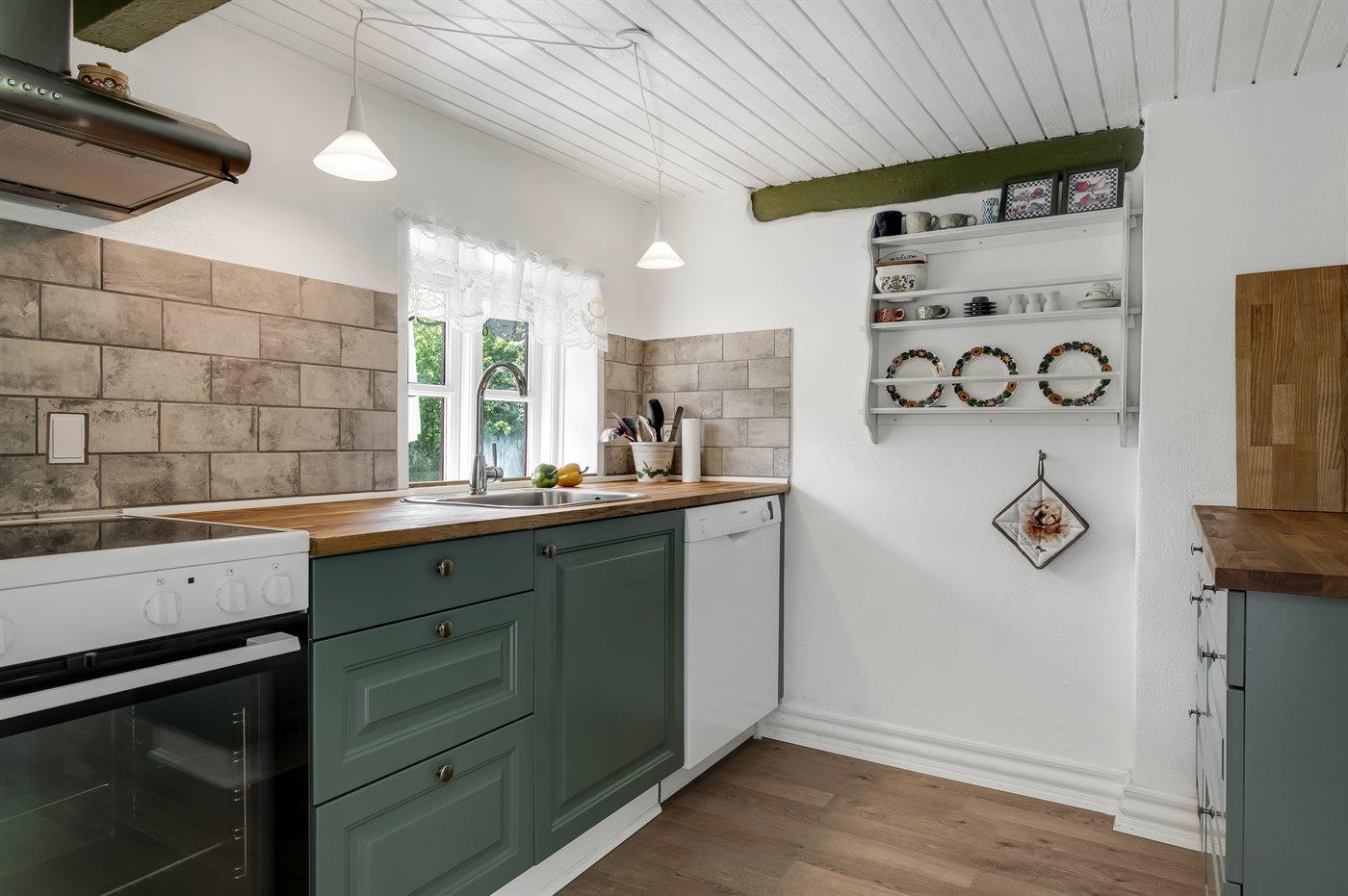 Køkkenet er udstyret med 1 køleskab. Der er 1 elkogeplader. Der er 1 keramiske kogeplader, varmluftovn samt opvaskemaskine.