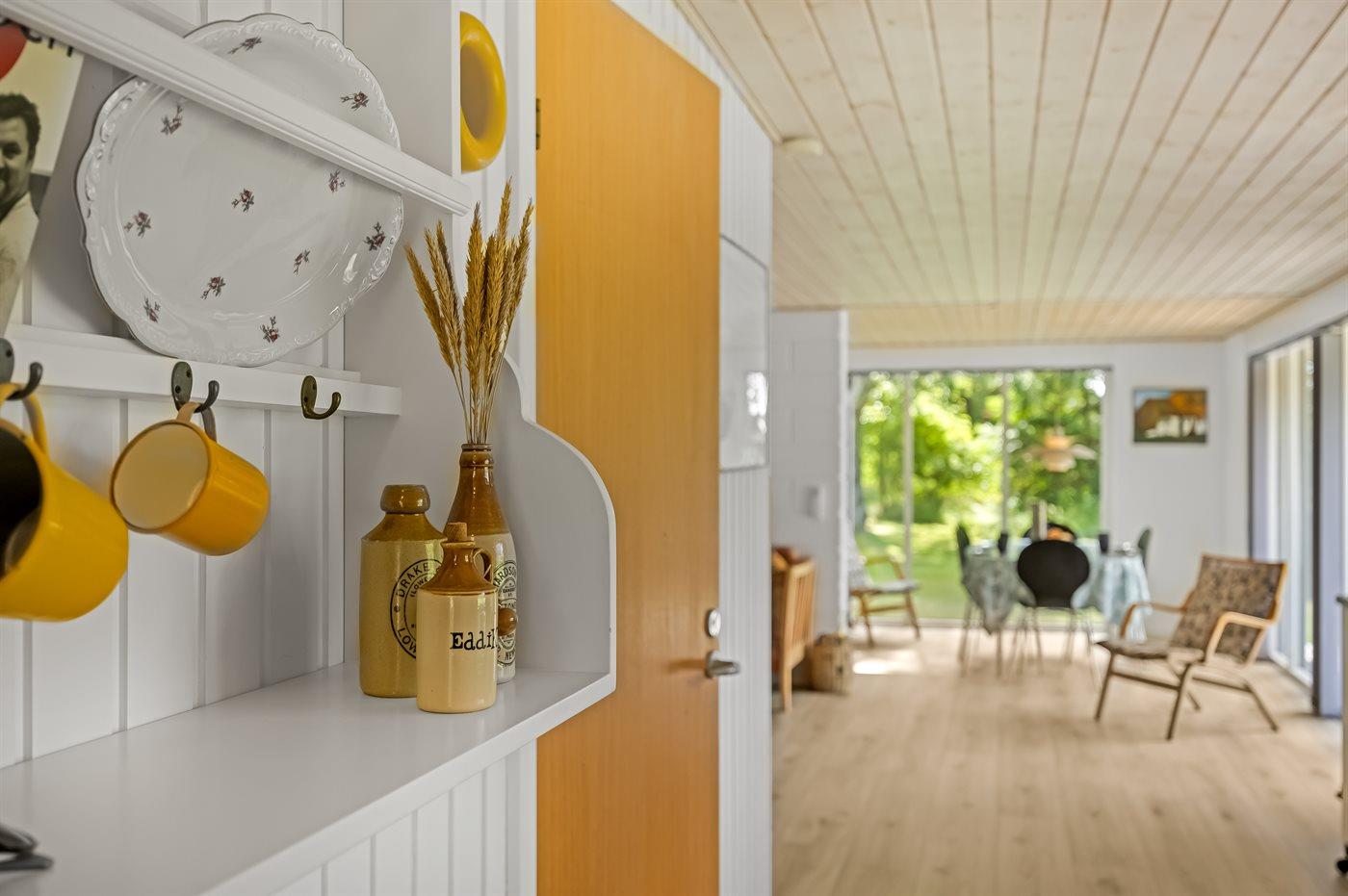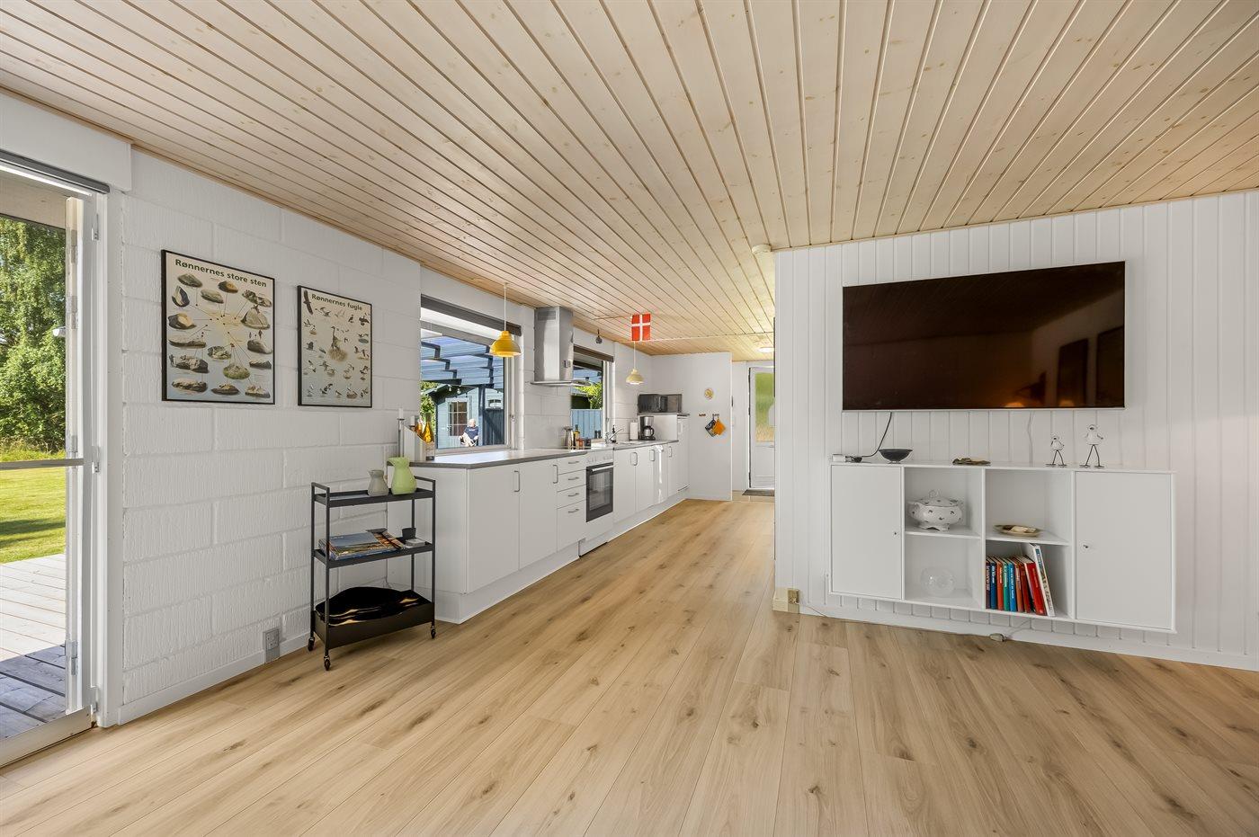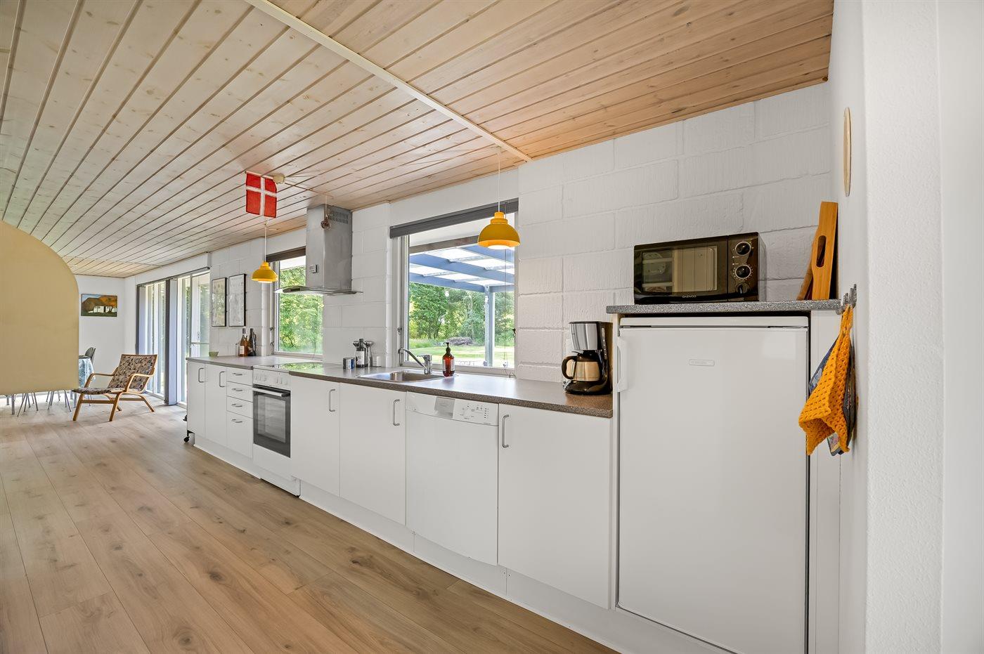 Køkkenet er udstyret med 1 køleskab. Der er 4 keramiske kogeplader, varmluftovn, mikrobølgeovn samt opvaskemaskine.
