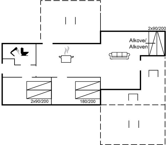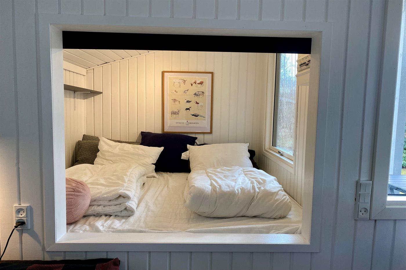 Der er i alt 3 soveværelser. Sovepladserne fordeler sig på: 4 sovepladser i dobbeltsenge. 2 sovepladser i alkove. 2 af disse sovepladser befinder sig i stuen.