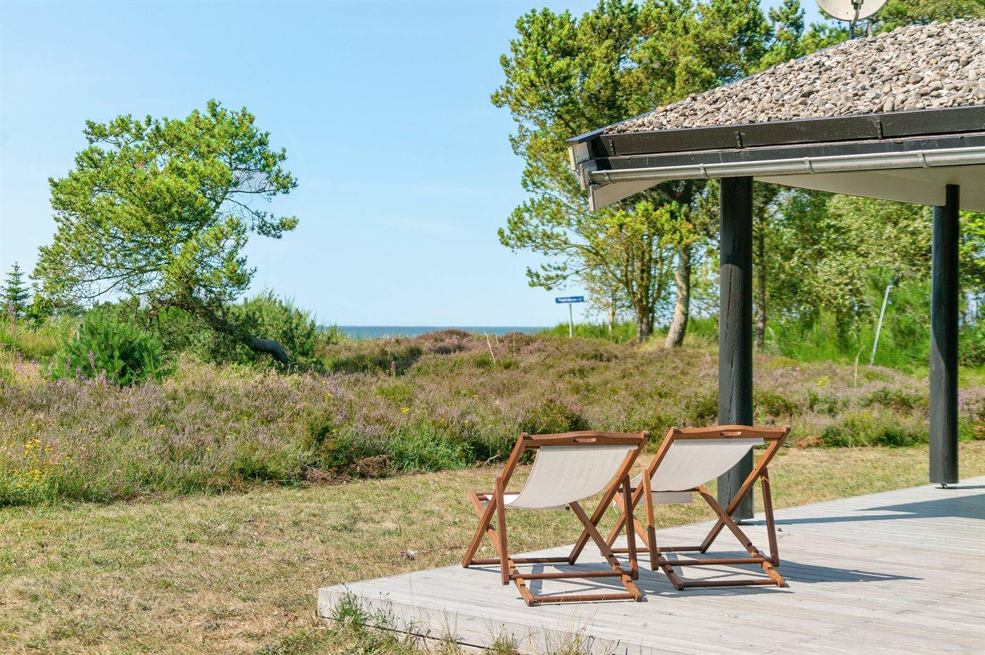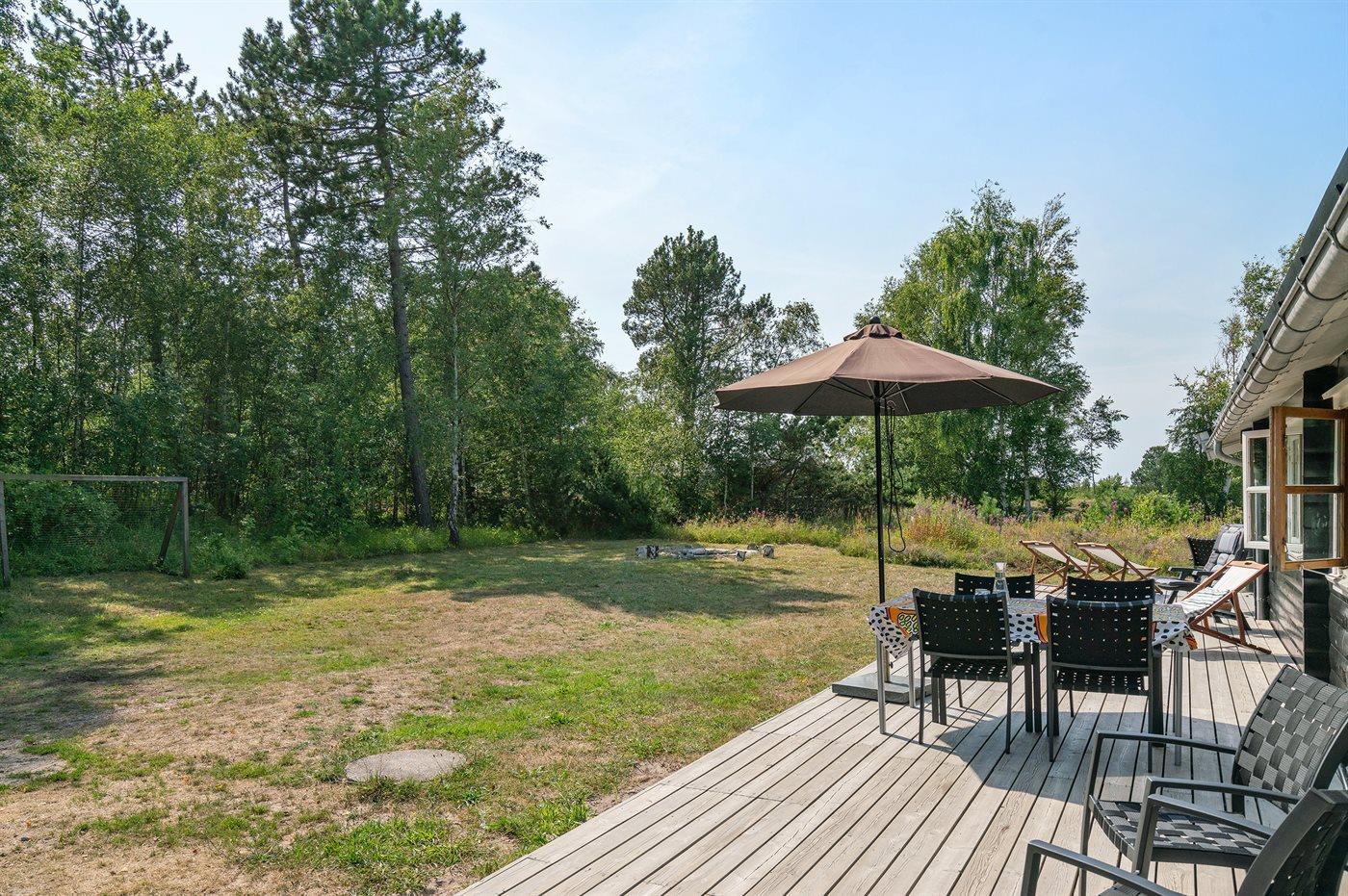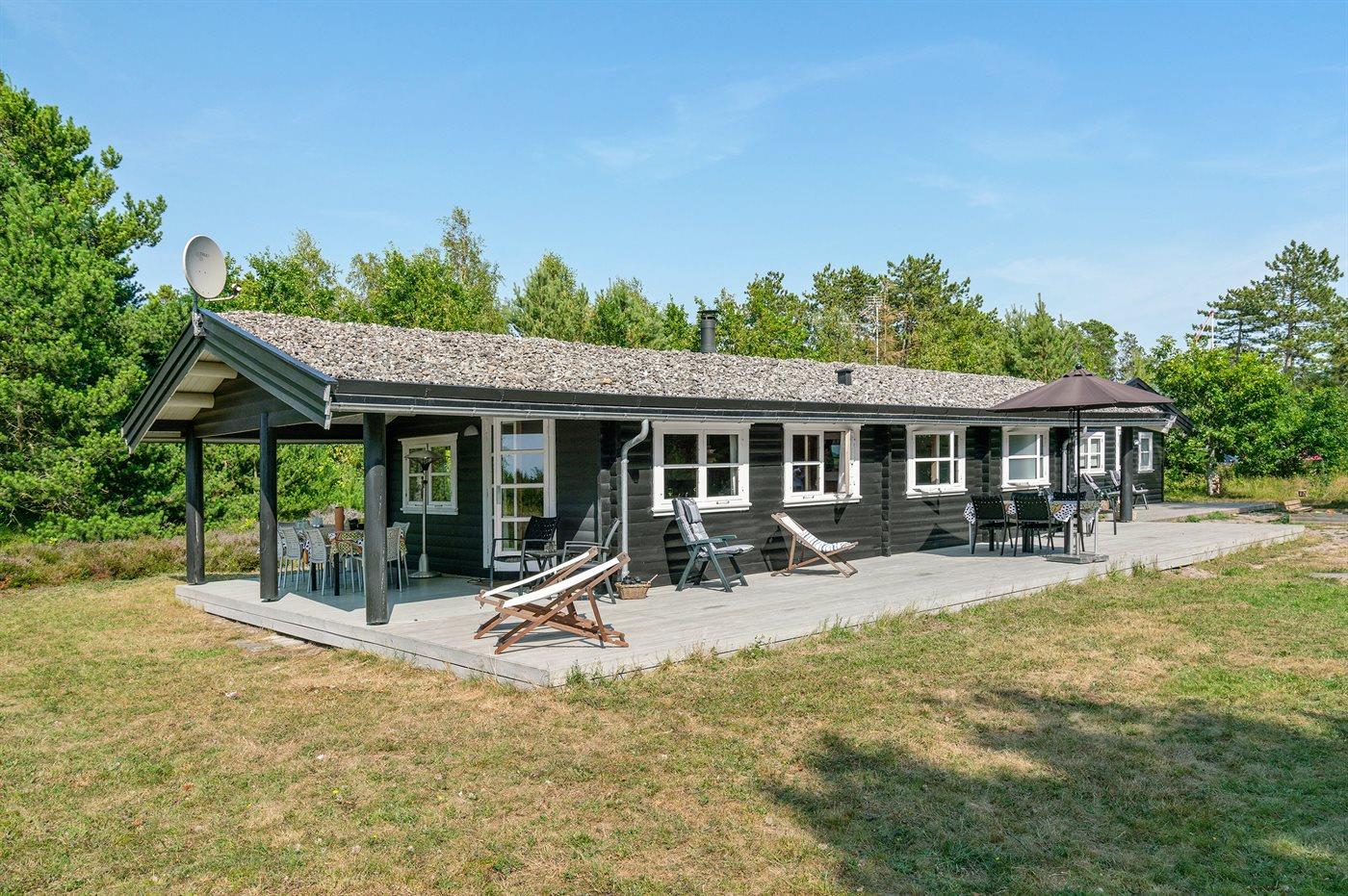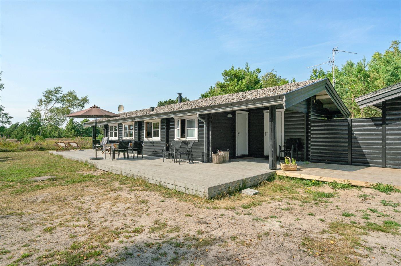 Ferieboligen er beliggende på en 3600 m² stor naturgrund, og der er 200 m til havet. Nærmeste forretning er beliggende i en afstand af 900 m. Til huset hører 50 m² åbent terrasseareal og 20 m² overdækket terrasse. Der er udendørs bruser med varmt vand, udekøkken, bålsted, fodboldmål og sandkasse. Parkering ved boligen.
