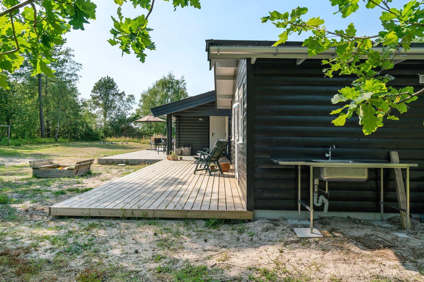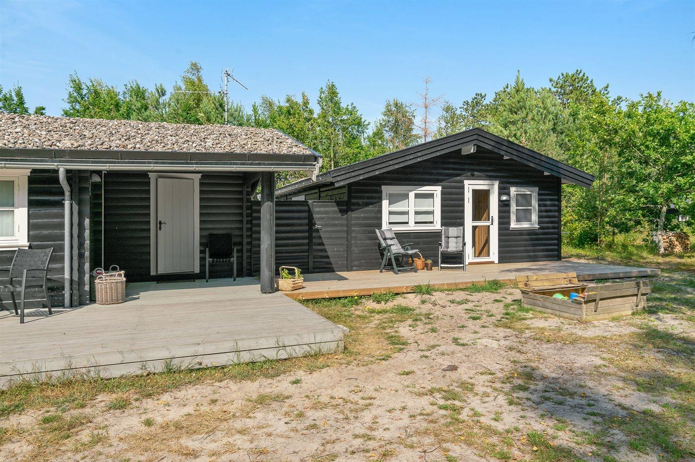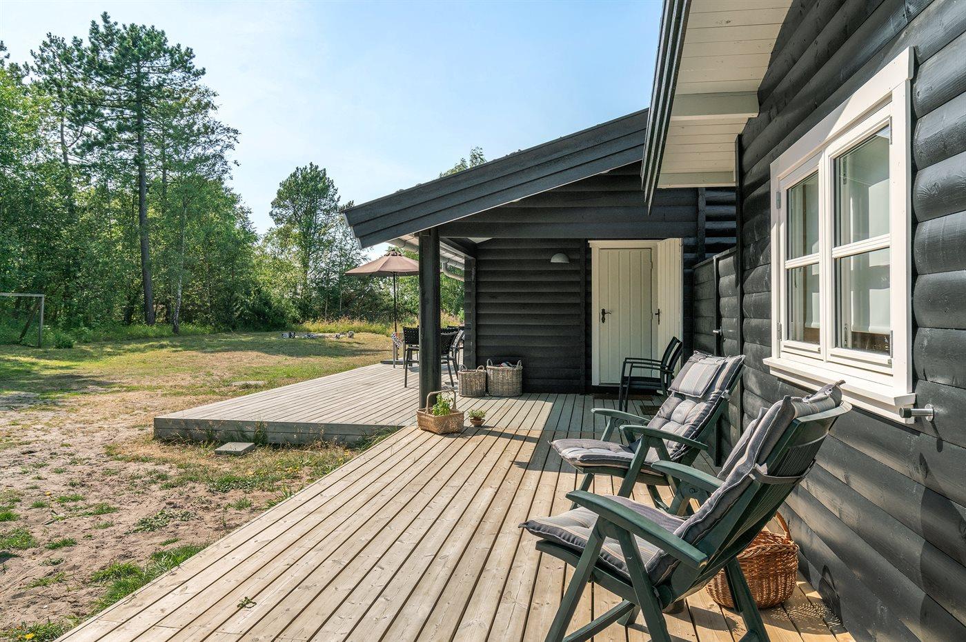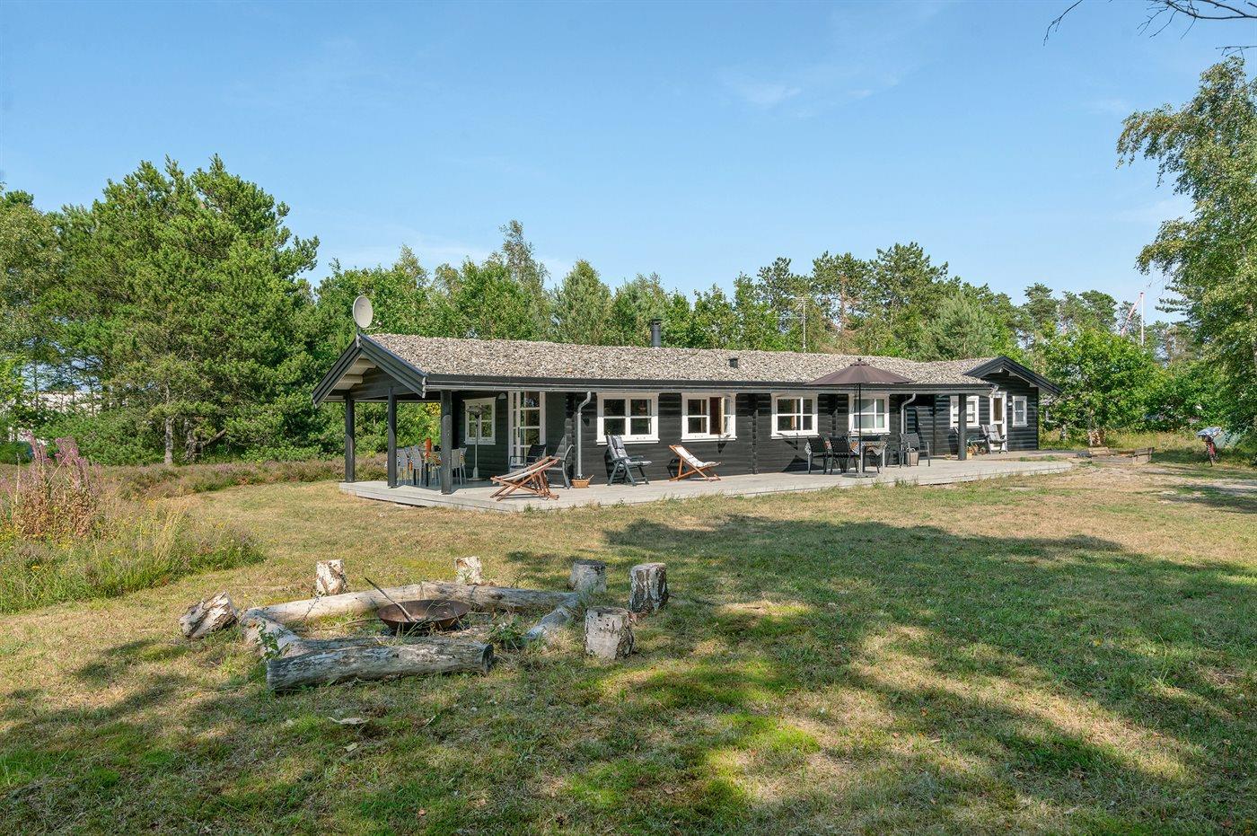 Ferieboligen er beliggende på en 3600 m² stor naturgrund, og der er 200 m til havet. Nærmeste forretning er beliggende i en afstand af 900 m. Til huset hører 50 m² åbent terrasseareal og 20 m² overdækket terrasse. Der er udendørs bruser med varmt vand, udekøkken, bålsted, fodboldmål og sandkasse. Parkering ved boligen.