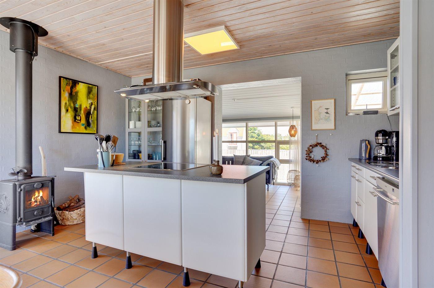 Køkkenet er udstyret med 1 køleskab. Der er 4 keramiske kogeplader, varmluftovn, mikrobølgeovn samt opvaskemaskine.