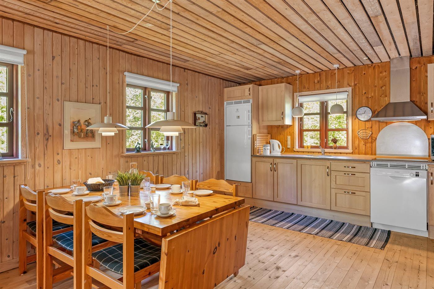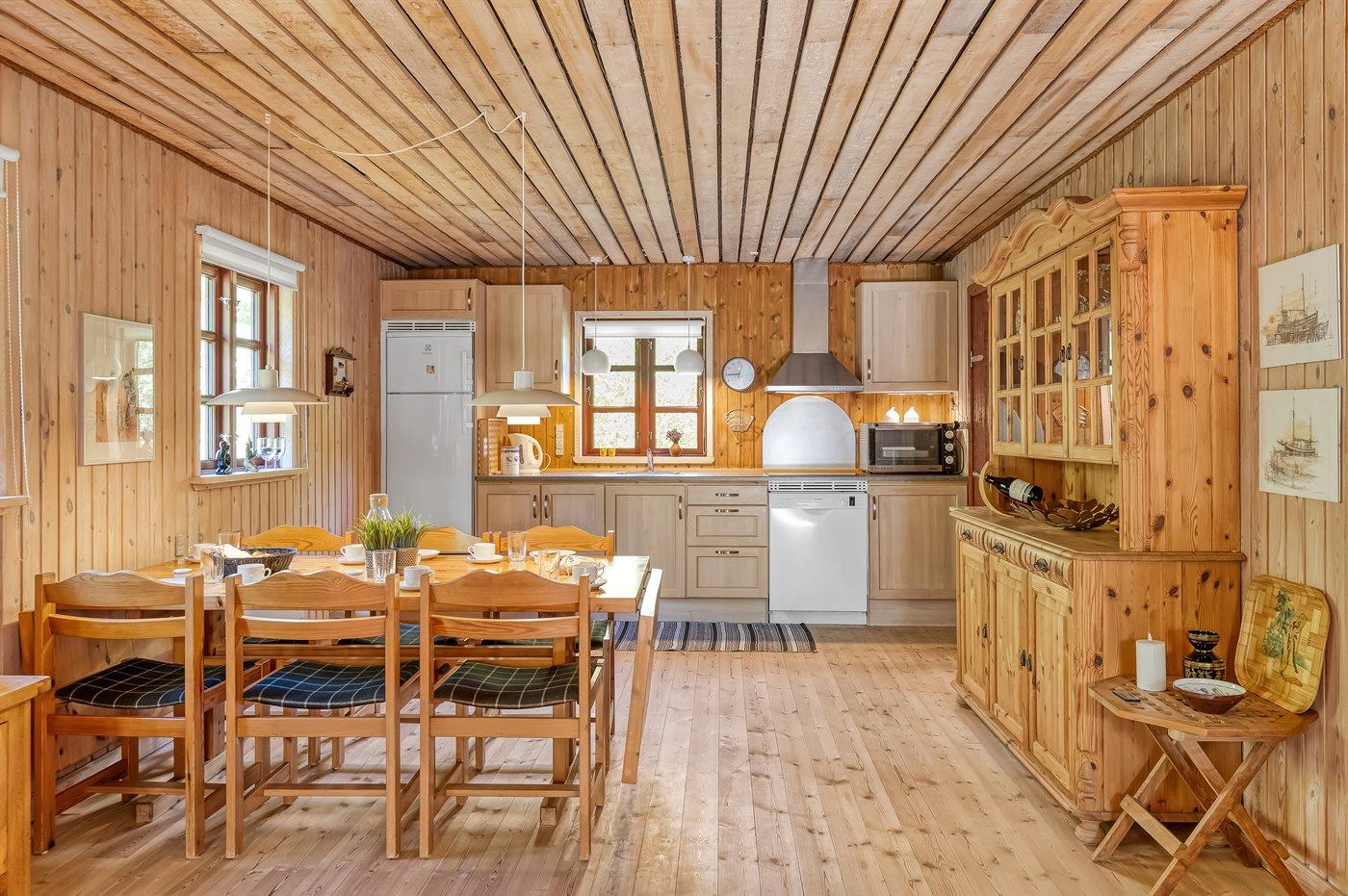 Køkkenet er udstyret med 1 køleskab. Der er 4 induktionskogeplader, bageovn, mikrobølgeovn samt opvaskemaskine.
