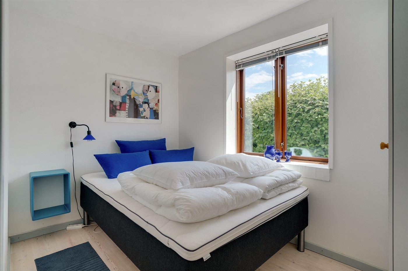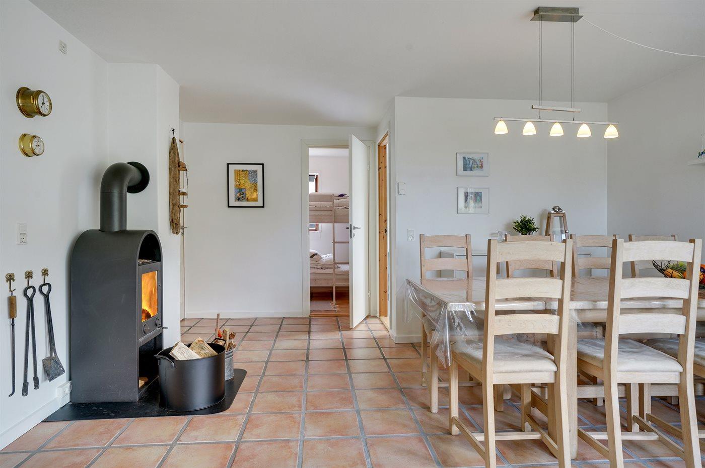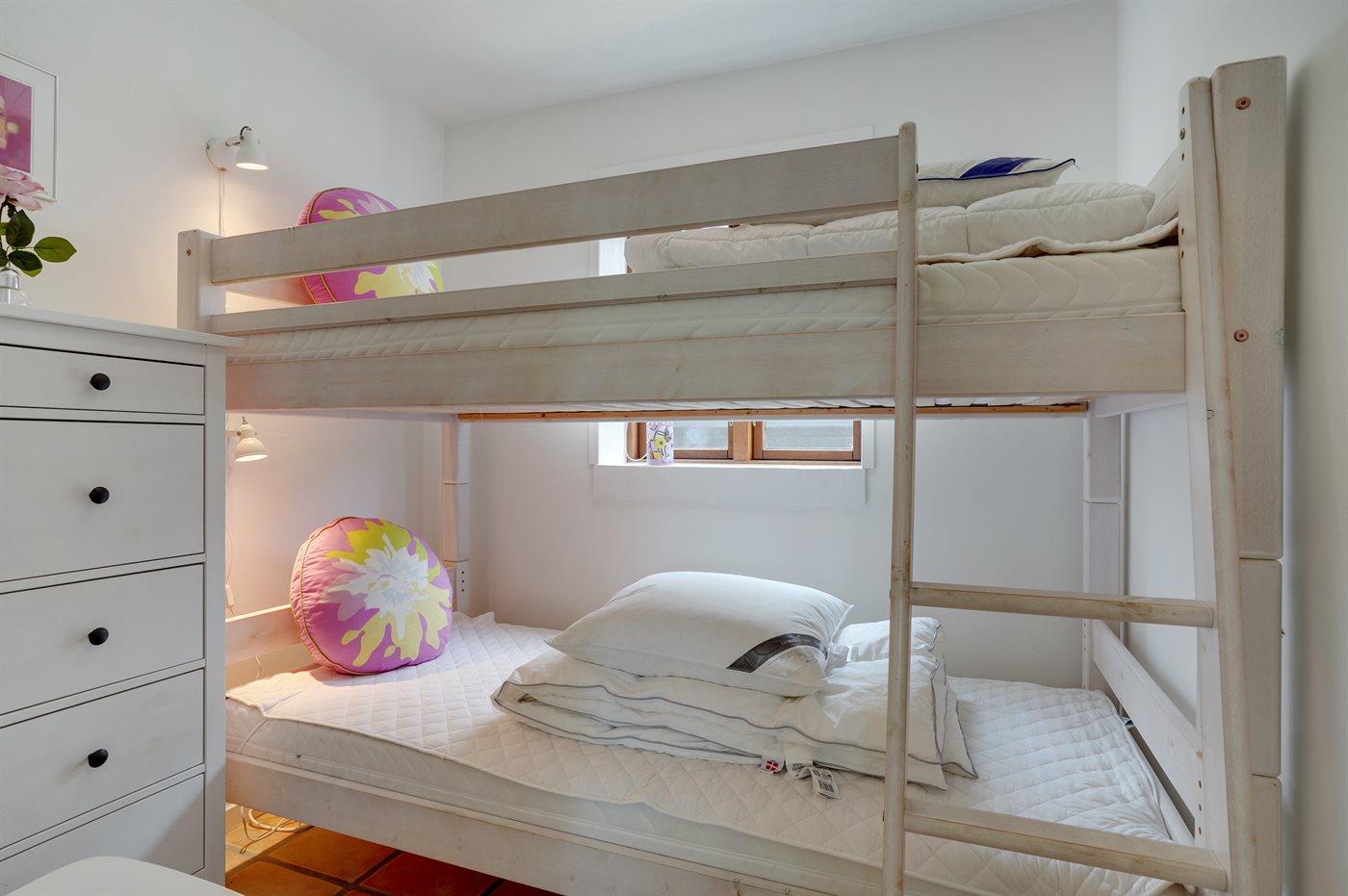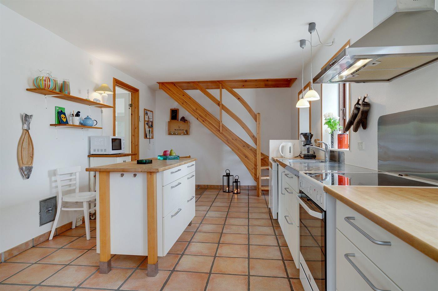 I hovedhuset er 3 soverum. Dejligt soveværelse med dobbeltseng, 1 værelse med 2 sovepladser i køjeseng og 1 værelse med dobbeltseng. I det veludstyrede køkken med gulvvarme, er der 1 køleskab, 1 fryser (kapacitet 125 liter) 4 keramiske kogeplader, varmluftovn, mikrobølgeovn samt opvaskemaskine.