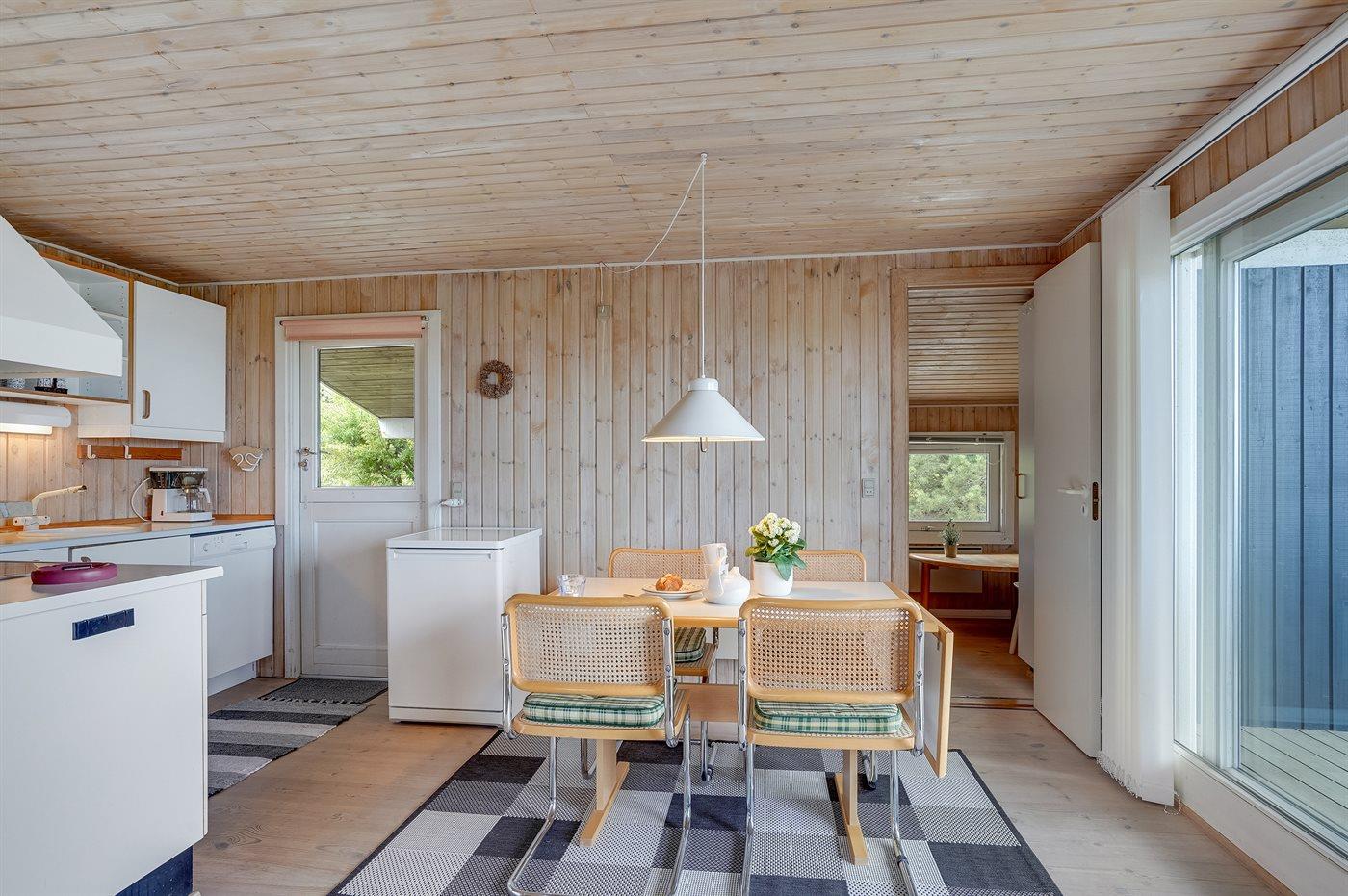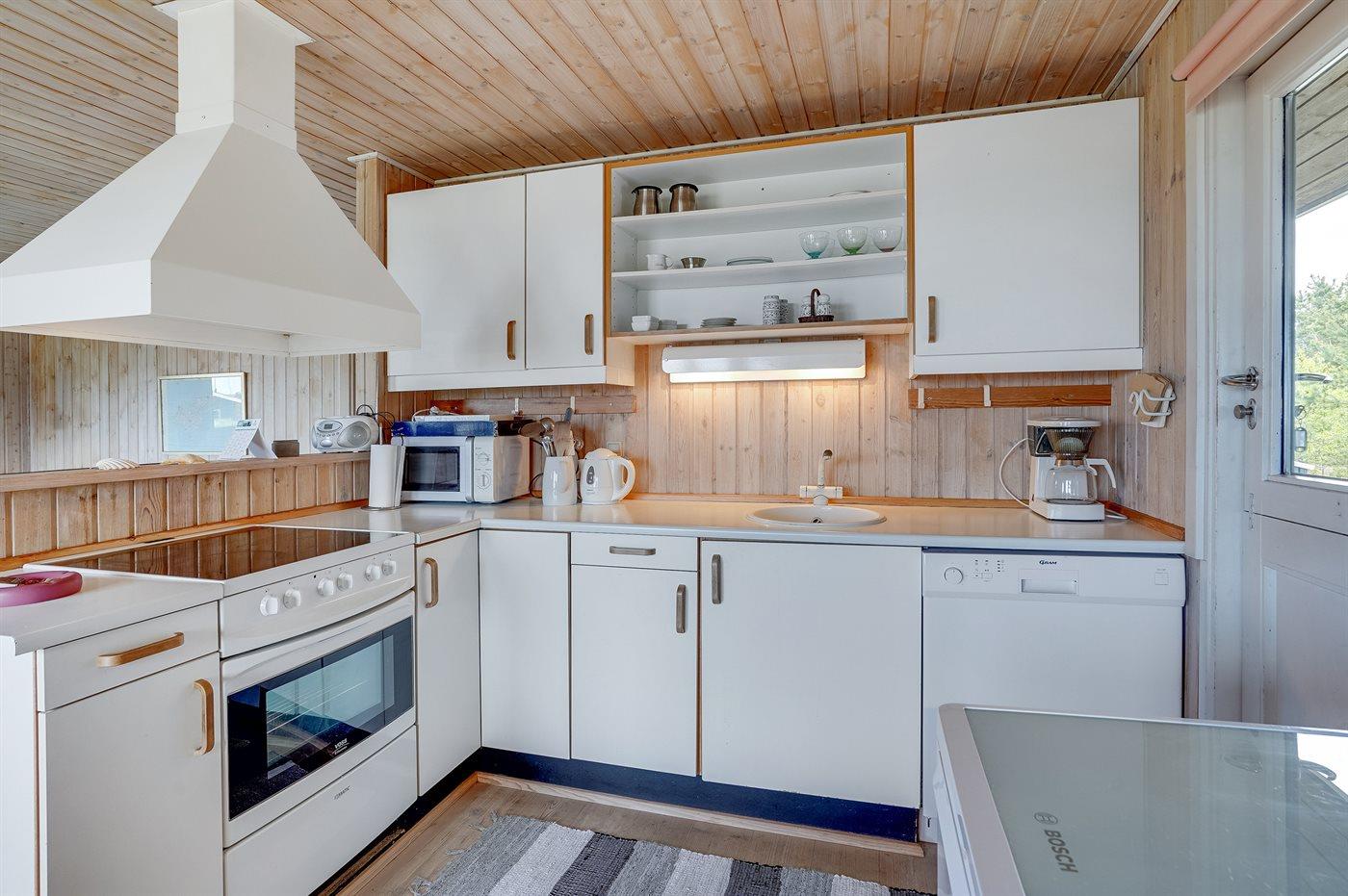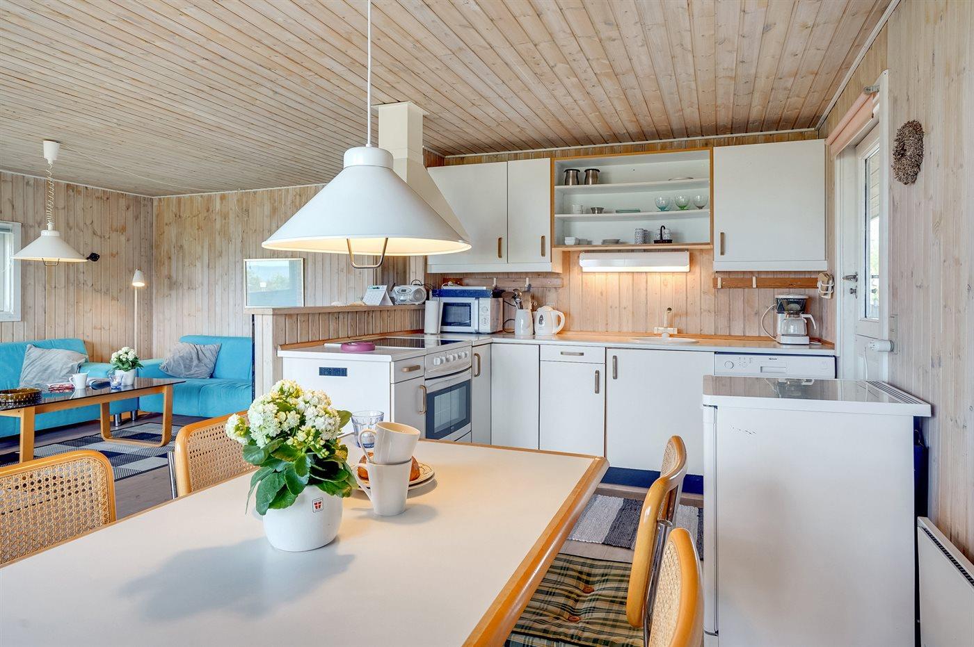 Køkkenet er udstyret med køleskab. Der er 4 keramiske kogeplader, varmluftovn, mikrobølgeovn samt opvaskemaskine Der findes desuden ekstra køleskab og fryser med en kapacitet på 100 liter i udhuset ved terrassen.