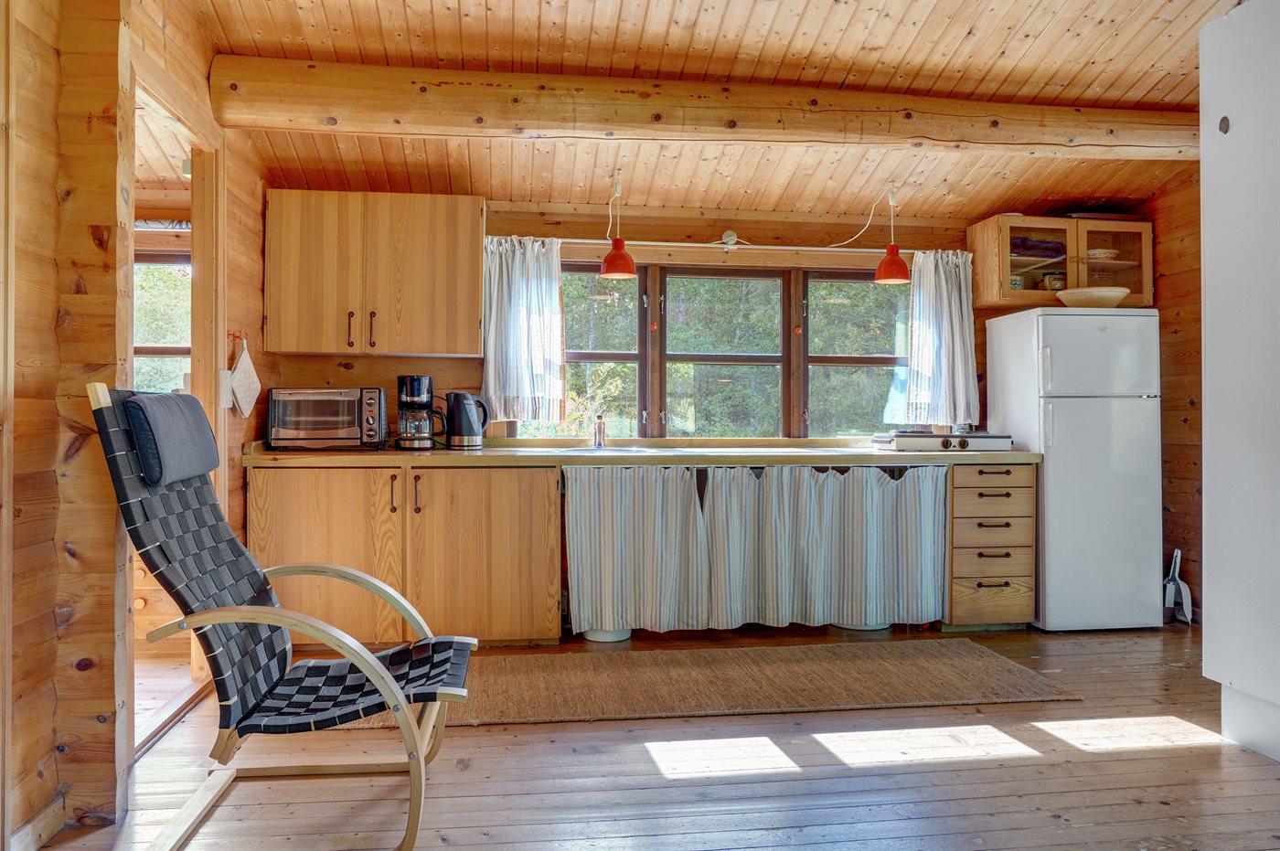 Køkkenet er udstyret med 1 køleskab. Der er 2 elkogeplader, miniovn.
