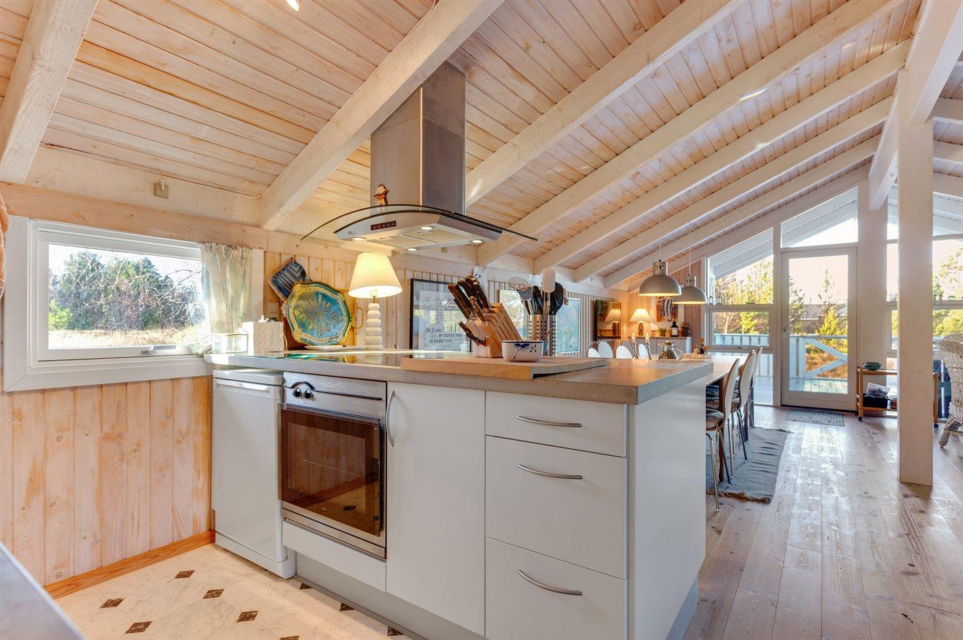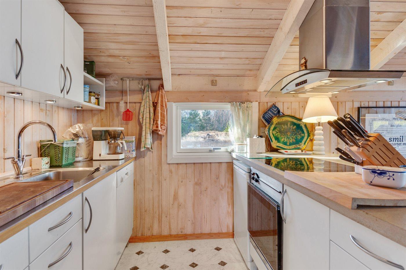 Køkkenet er udstyret med 1 køleskab. Der er 4 elkogeplader, varmluftovn samt opvaskemaskine.