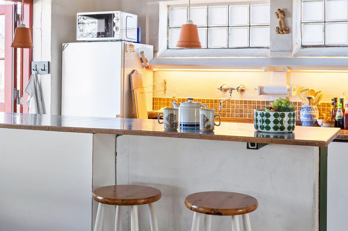 Køkkenet er udstyret med 1 køleskab. Der er 4 elkogeplader, varmluftovn, mikrobølgeovn samt opvaskemaskine.