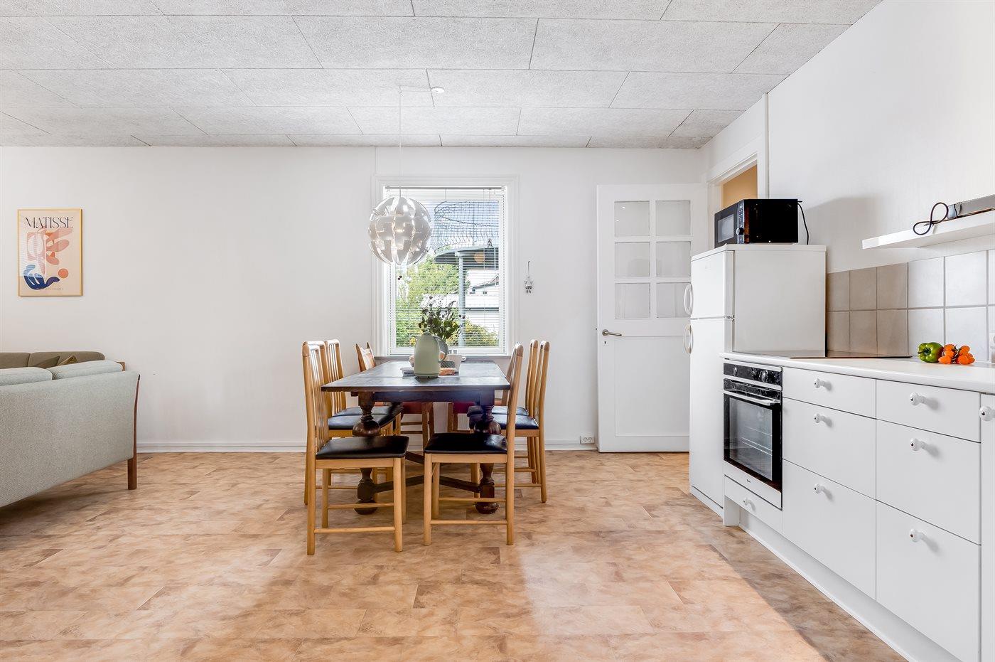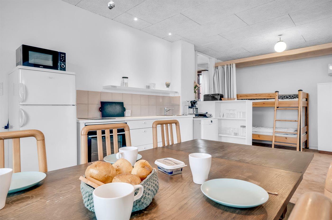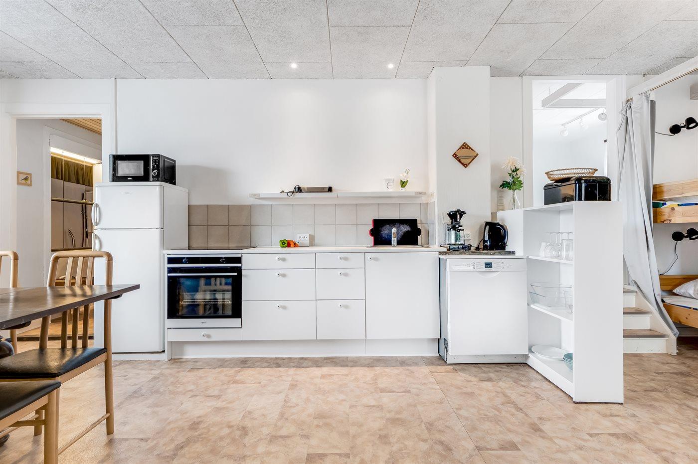 Køkkenet er udstyret med 1 køleskab. Der er 4 induktionskogeplader, varmluftovn, mikrobølgeovn samt opvaskemaskine.
