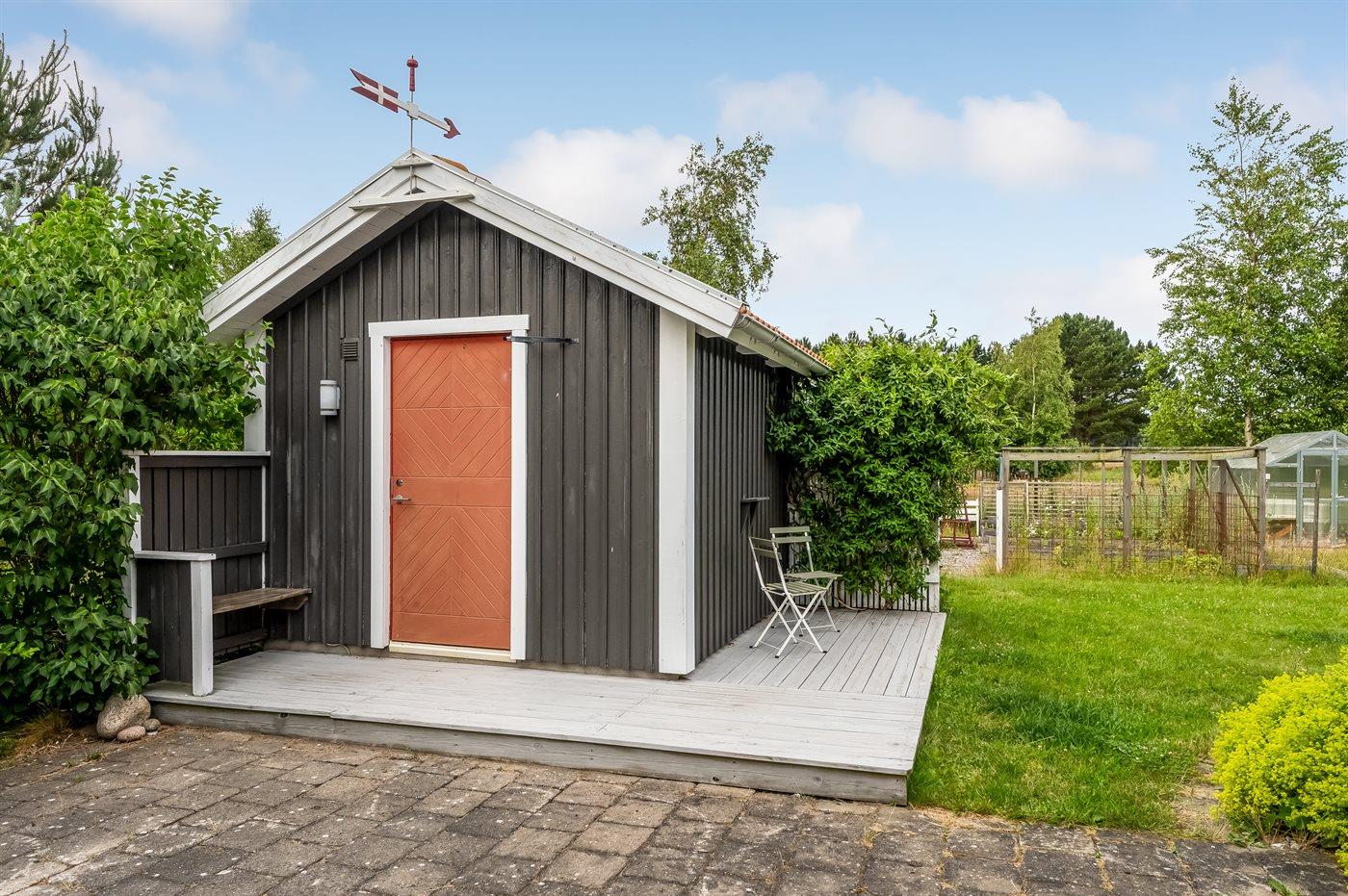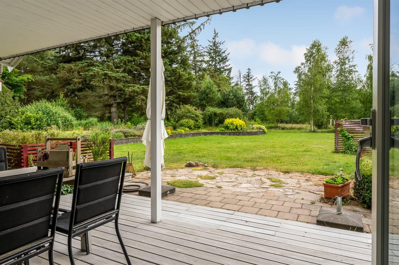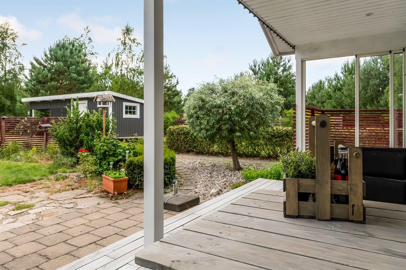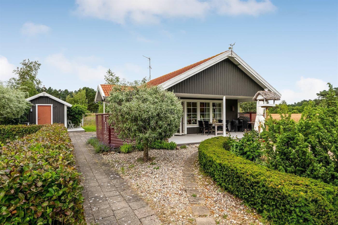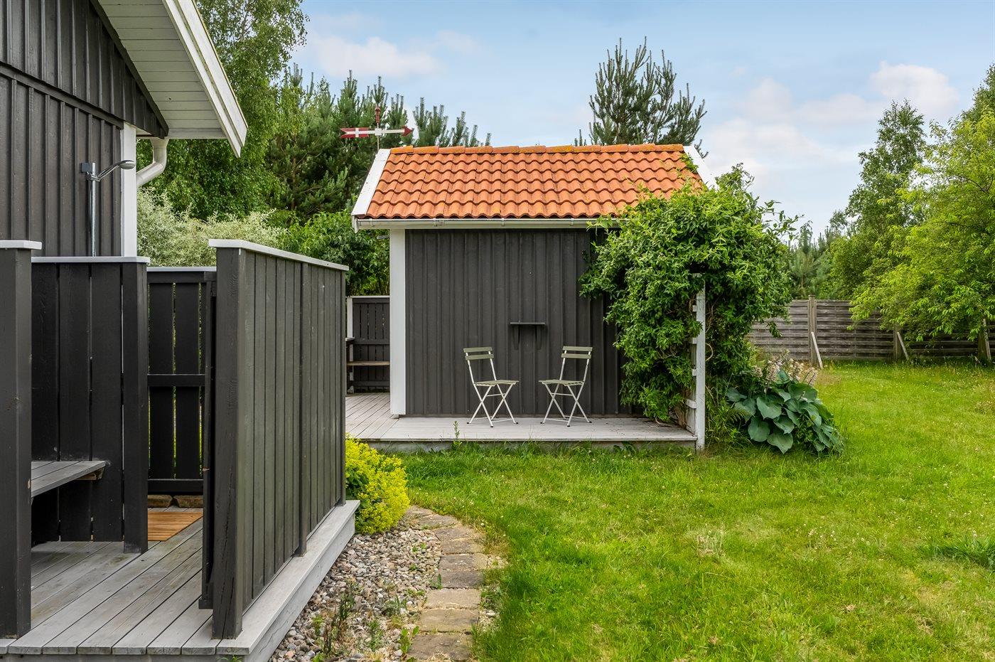 Ferieboligen er beliggende på en 2039 m² stor havegrund. Grunden er indhegnet. Der er 800 m til havet. Nærmeste forretning er beliggende i en afstand af 1400 m. Der er en golfbane i en afstand af 7200 m. Til ferieboligen hører åbent terrasseareal. Desuden er der overdækket terrasse. Ligeledes er der adgang til udestue. Der ligger en legeplads i en afstand af 1400 m. Udendørs bruser. Grill til rådighed. Der er carport til rådighed. Der er installeret stik til opladning af elbil. CEE stik. Med 11 kW ladeeffekt. Parkering ved ferieboligen.